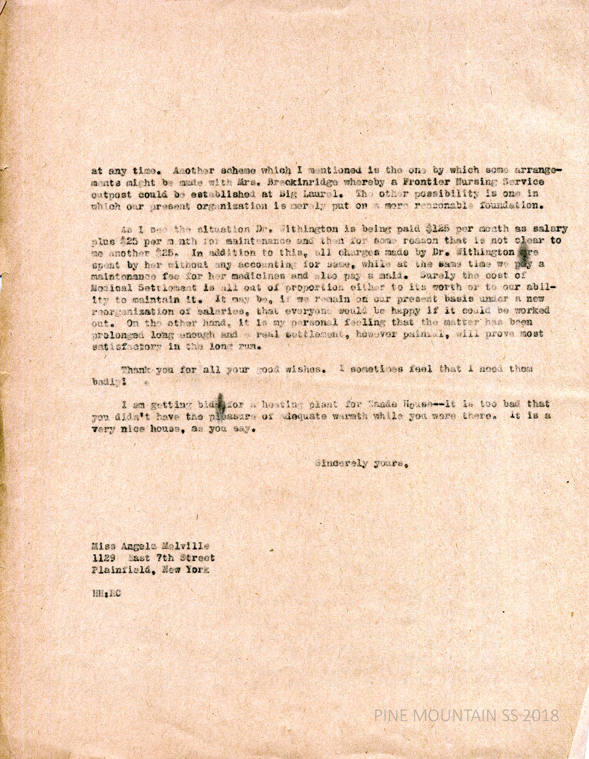 [melville_corr_056.jpg] and [melville_corr_056a.jpg] Hubert Hadley, PMSS Director, to Melville in Plainfield, NY, September 17, 1930. Asked for information concerning the agreement made with Dr. [Alfreda] Withington, regarding salary, vacations, etc., in order to calculate her vacation versus her salary. PMSS’s financial program needs to be reorganized concerning income and expenses; asked for Melville’s opinion about discontinuing the [Big Laurel] Medical Settlement, reorganizing it so it will cost less or turning it over to Frontier Nursing Service; need to know general attitude of the Board. Suggests several ways to reorganize the Medical Settlement. (page 2) Getting bids for a heating plan for Zande House.