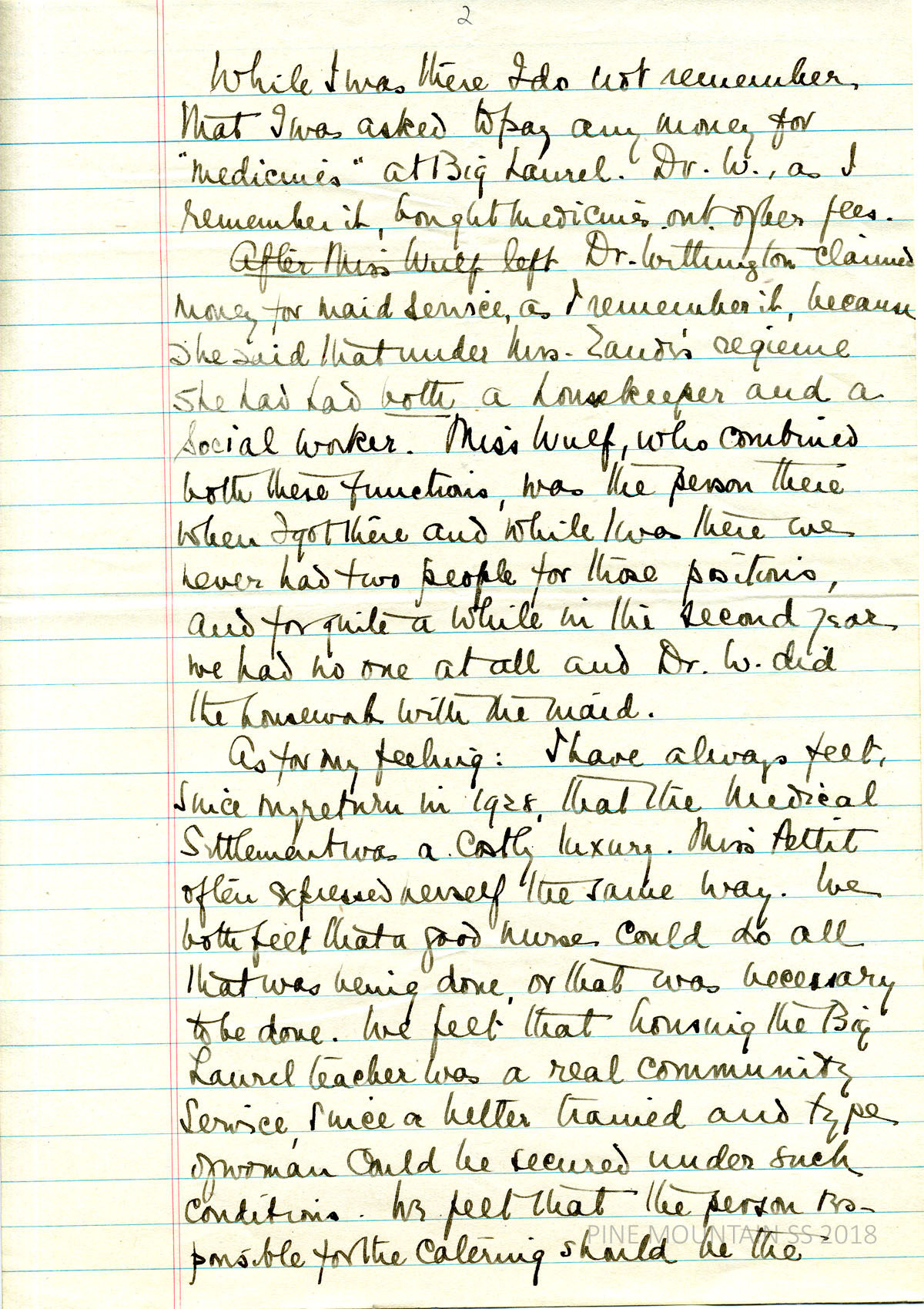[melville_corr_057b.jpg] (page 2) Continues explaining Dr. Withington’s employment as she remembered it, mentioning Miss Wulf as her housekeeper and social worker. States her opinion about the Medical Settlement, saying she, along with Miss Pettit, felt it was a “costly luxury.”