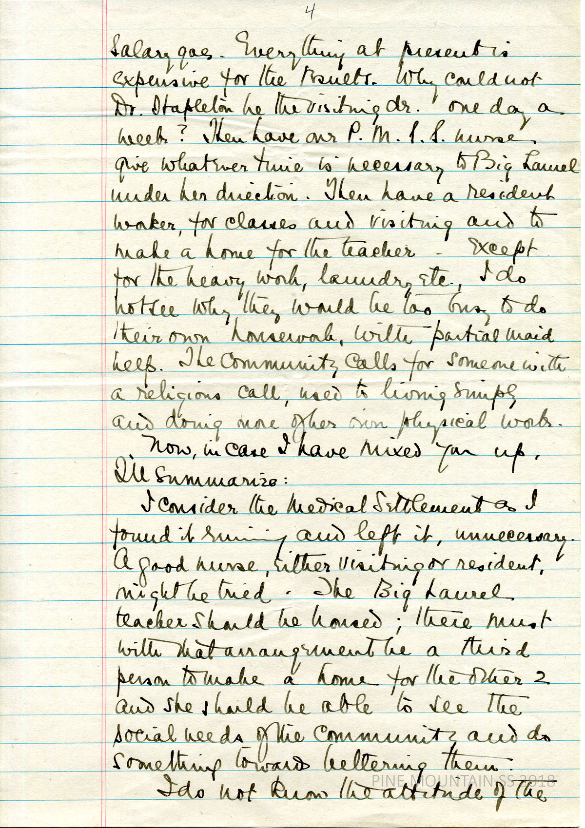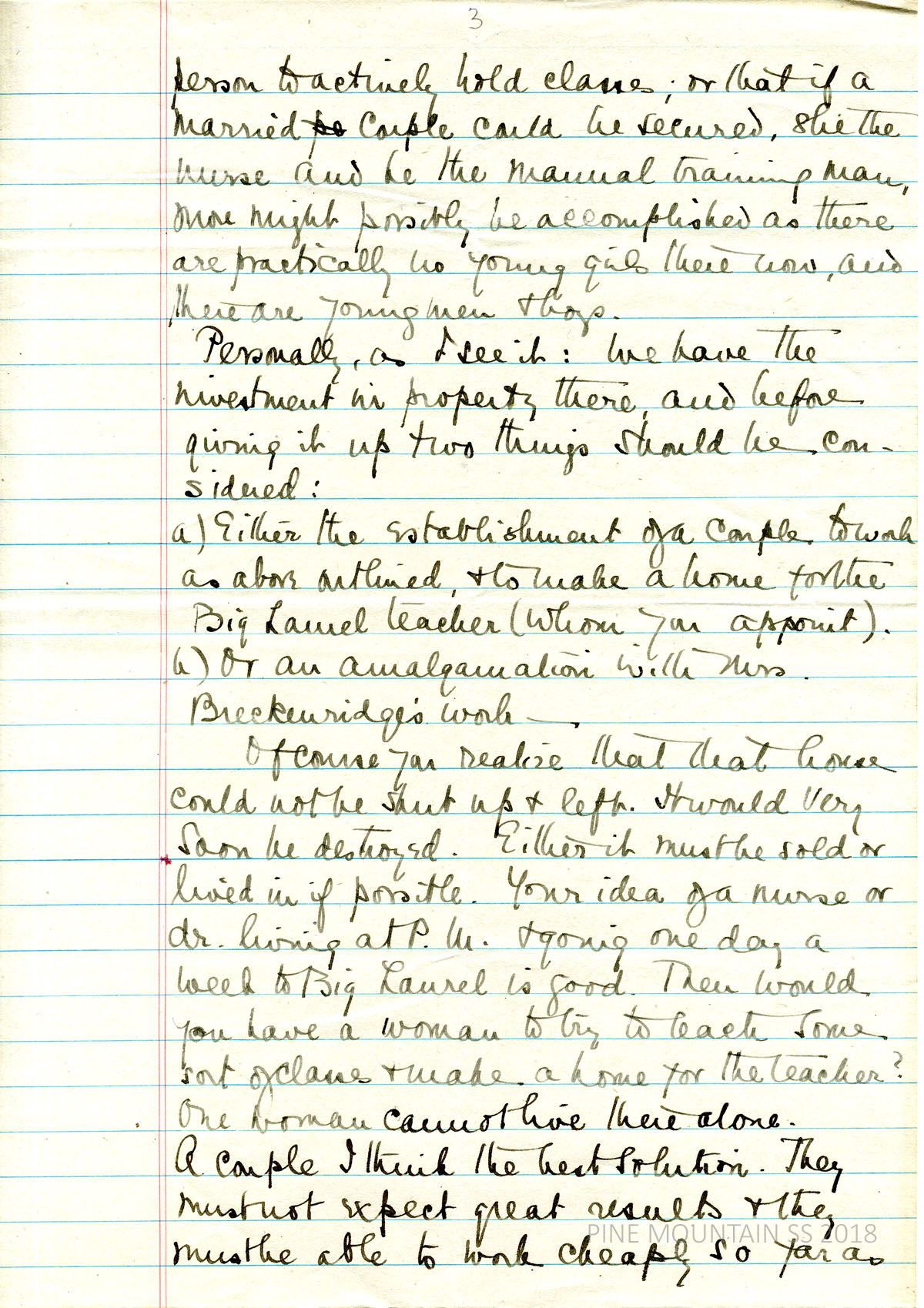 [melville_corr_057c.jpg] (page 3) Gives her opinions about the future of Big Laurel Medical Center: “we have the investment in property there and before giving it up two things should be considered:” (a) Hire a married couple (nurse & teacher) or a lone teacher (b) “or an amalgamation with Mrs. Breckenridge’s work.” States problems with leaving the house empty or having one teacher live there alone.