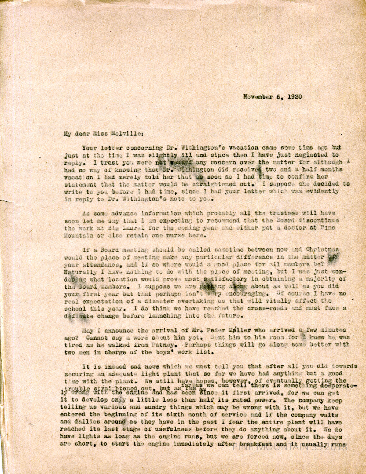 [melville_corr_058.jpg] and [melville_corr_058a.jpg] Hadley to Melville in NYC, November 6, 1930. Received Melville’s reply to Dr. Withington. “I am expecting to recommend that the Board discontinue the work at Big Laurel for the coming year and either put a doctor at Pine Mountain or else retain one nurse here.” Arrival of Peder Moller; problems with the “light plant.” (page 2) Preparing for the Nativity Play; success of the Hallowe’en party.
