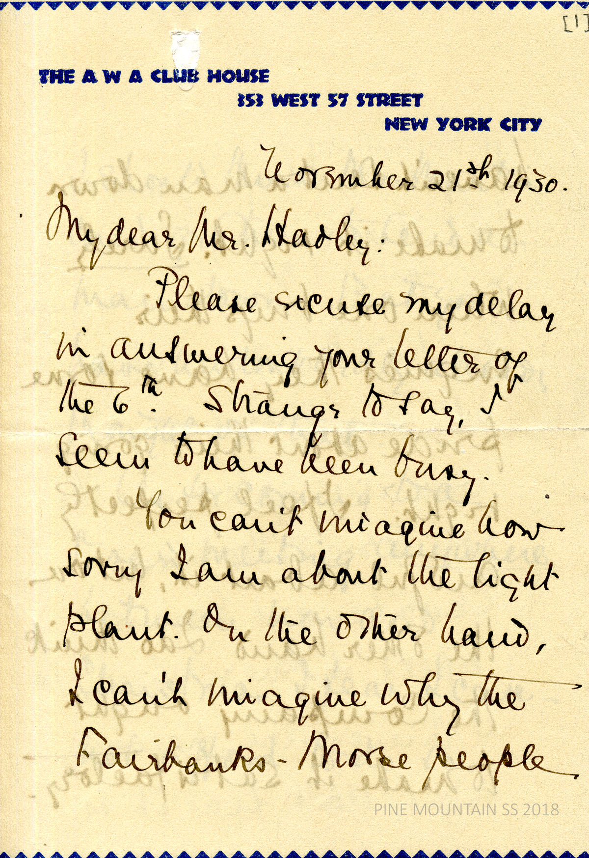 [melville_corr_060.jpg] through [melville_corr_060e.jpg] Original handwritten 7-page letter from Melville at The AWA Club House, NYC, to Hadley, November 21, 1930.