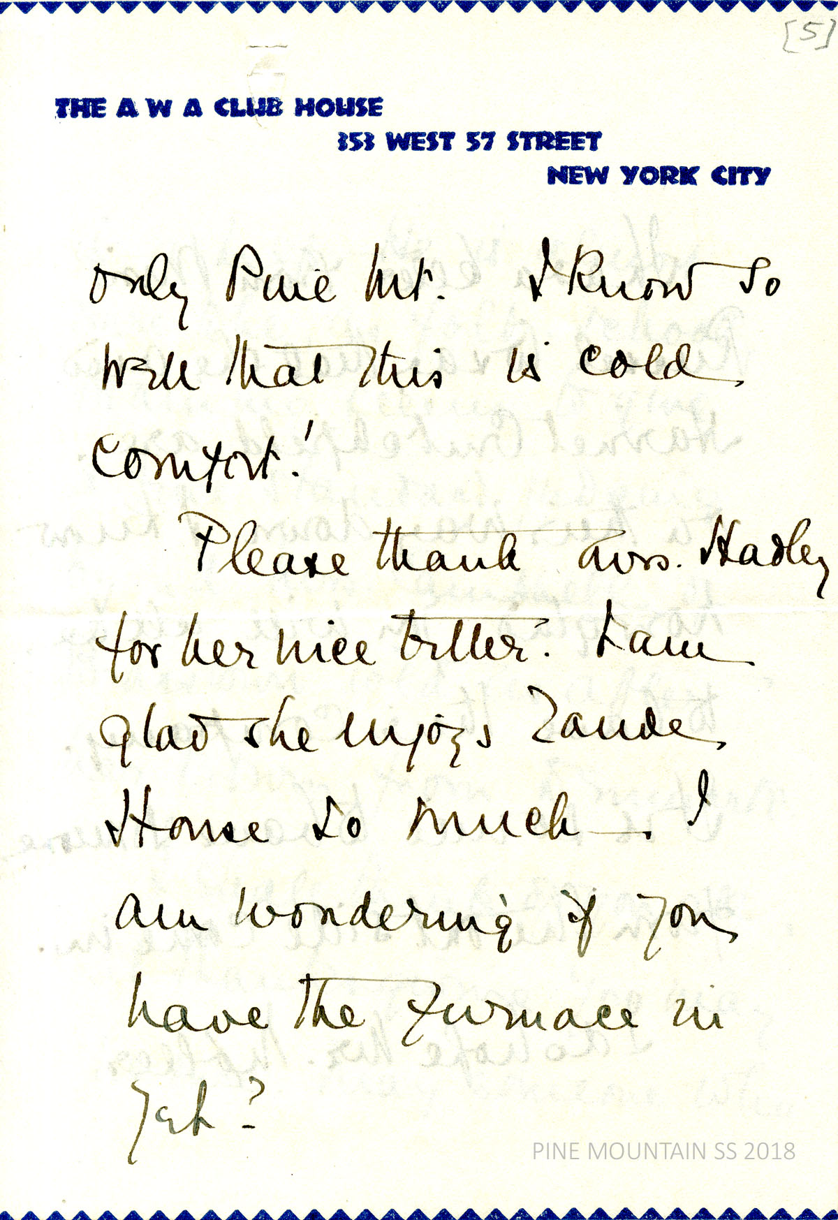 [melville_corr_060c.jpg] (page 5) Glad that Mrs. Hadley enjoys Zande House; is the furnace in yet?