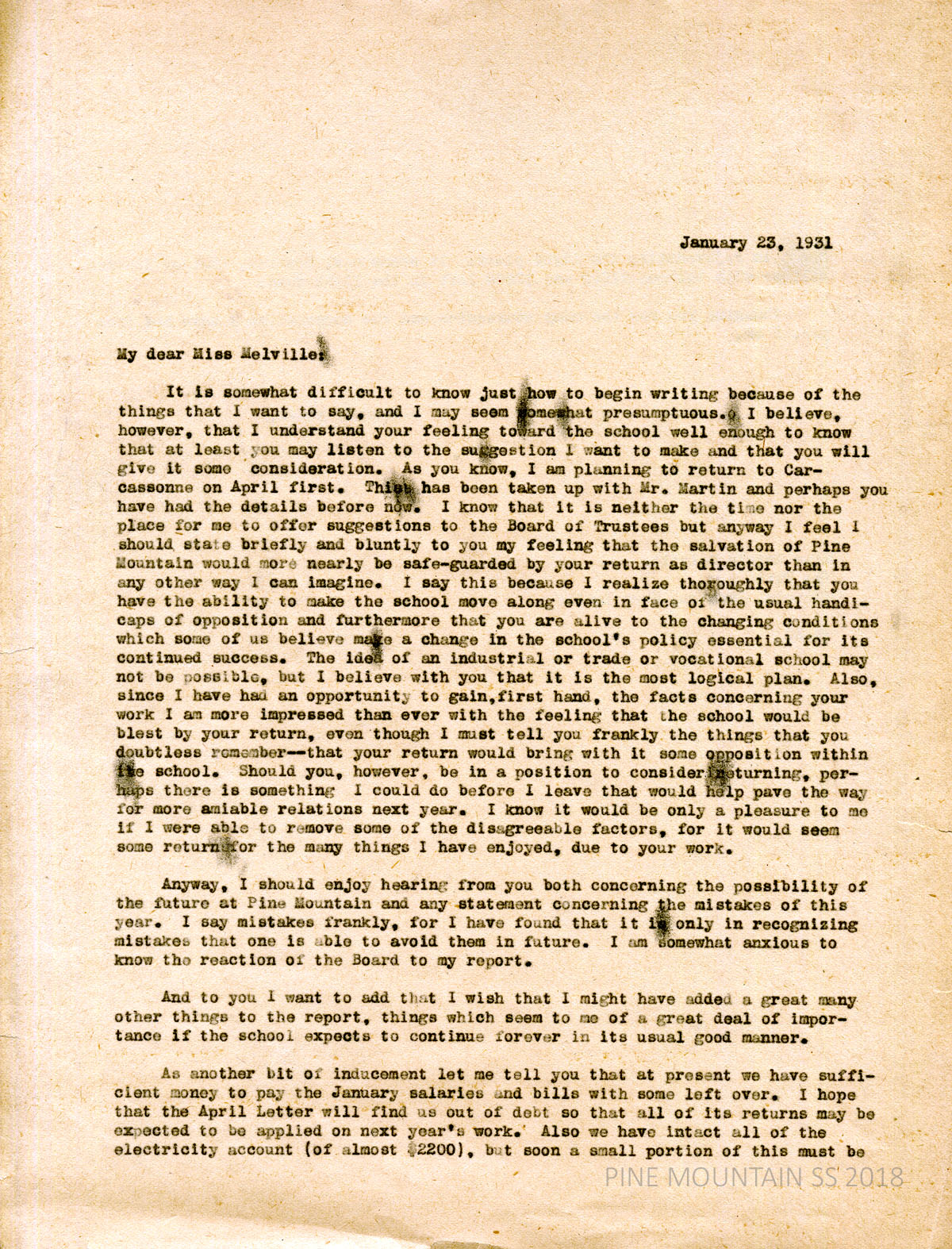 [melville_corr_062.jpg] and [melville_corr_062a.jpg] Hadley to Melville in Jamaica, West Indies, January 23, 1931. Planning to return to Carcassonne on April 1st; believes “that the salvation of Pine Mountain would more nearly be safe-guarded by your (Melville’s) return as director…” feeling that Melville is “alive to the changing conditions…” An industrial or trade or vocational school is the most logical plan; Melville may face some opposition; asks Melville for a statement concerning the year’s mistakes; describes school’s finances and the “light fund.”