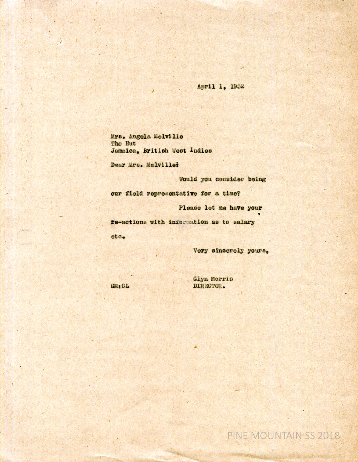 [melville_corr_072.jpg] Morris to Melville at The Hut in Jamaica, British West Indies, April 1, 1932. Asks her to be PMSS field representative for a time.