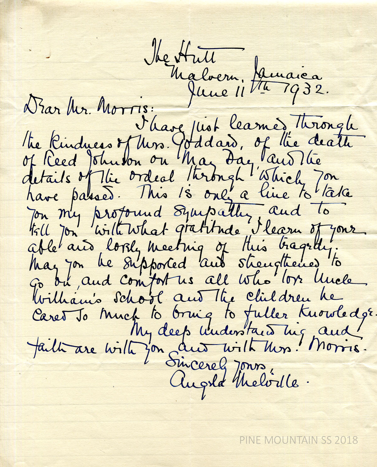 [melville_corr_074.jpg] Original handwritten letter from Melville at The Hutt (sic), Malvern, Jamaica, to Morris, June 11, 1932. Extends sympathy for the death of Reed Johnson (teacher) on May Day.