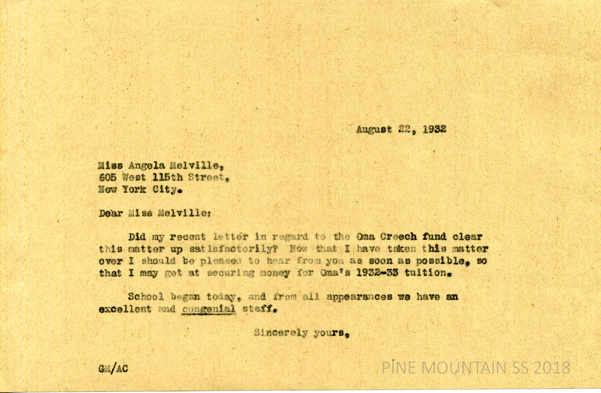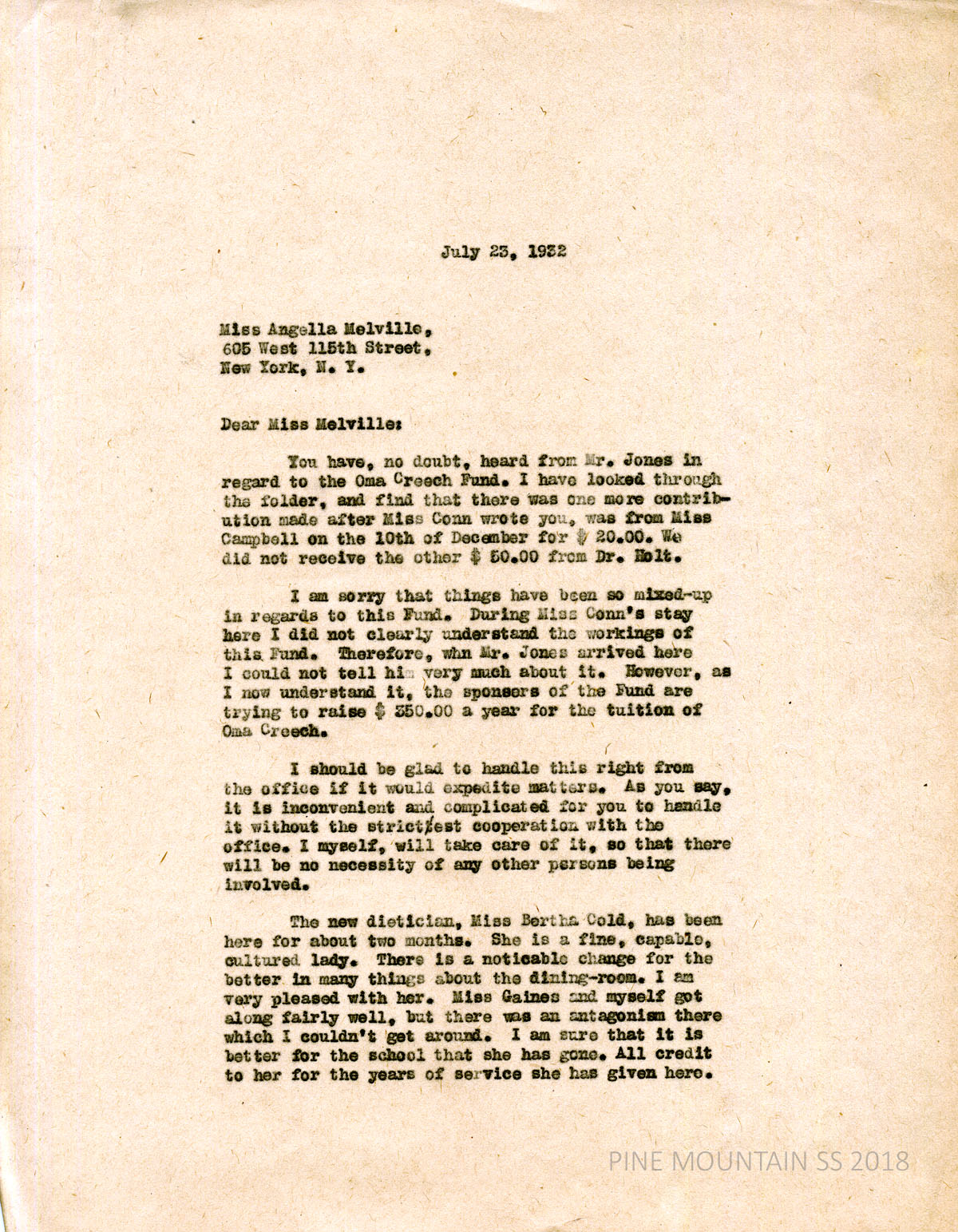 [melville_corr_076.jpg] and [melville_corr_076a.jpg] 2-page letter from Morris to Melville in NYC. (page 1) Discusses donors to the Oma Creech Fund. “As I now understand it, the sponsors of the Fund are trying to raise $350 a year for Oma Creech’s tuition.” Offers to handle it. Describes the new dietician, Miss Bertha Cold and the former one, Miss Gaines.