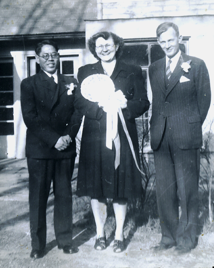 - [Dorothy Nace] with the bride’s bouquet. [T.C. Liu and Burton Rogers to either side.] [nace_1_068b.jpg]