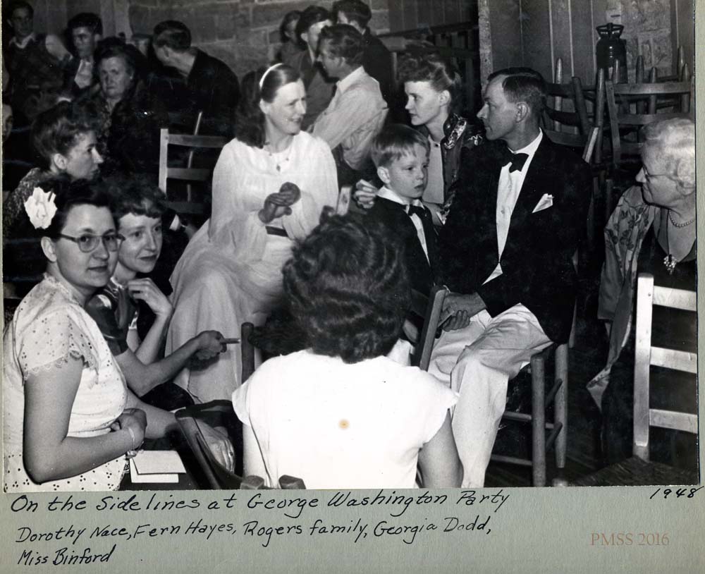 - “On the sidelines at George Washington Party 1948.” Dorothy Nace, Fern Hayes. Mary Rogers, Georgia Dodd, Burton Rogers with Christopher. with list of names. [nace_II_album_102.jpg]
