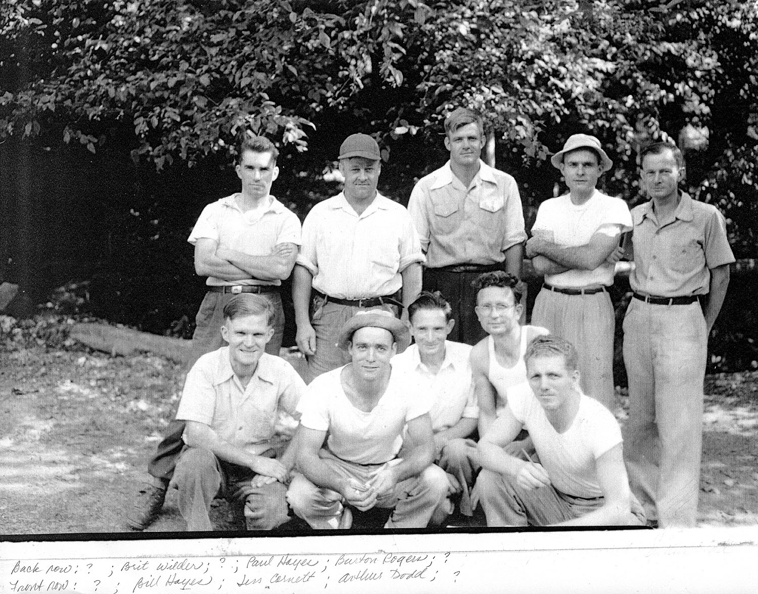 - 41 Staff at PMSS. Front: Ronald Henderson; William Hayes; Jess Cornett, Arthur Dodd; [?]. Back row: [?]; Brit Wilder; Hobart Wilder; Paul Hayes; Burton Rogers.[ser_19_workers_misc_groups_0041.jpg]