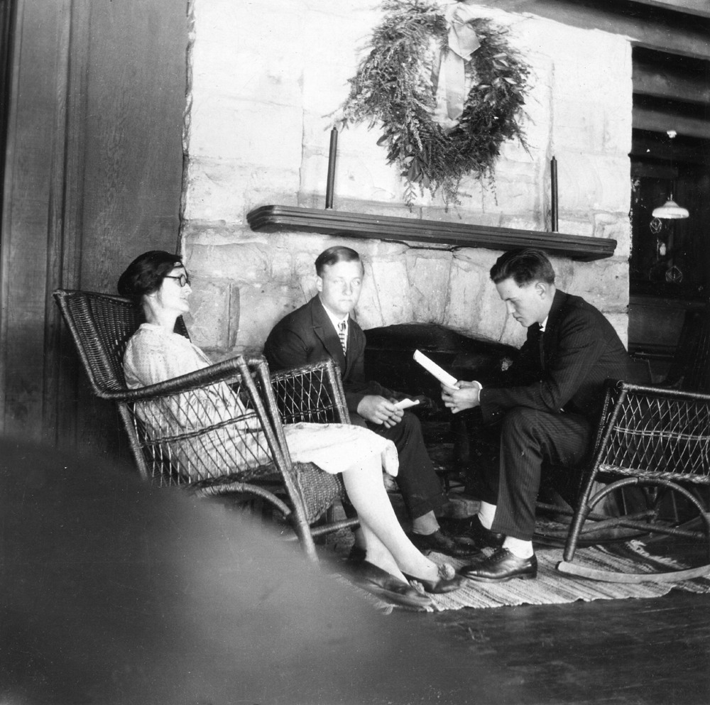 - Big Log. Interior view of living room with Burton, Mary, Peter (r.) and Christopher Rogers (l.), c. 1950s. [II_08_big_log_330b.jpg]