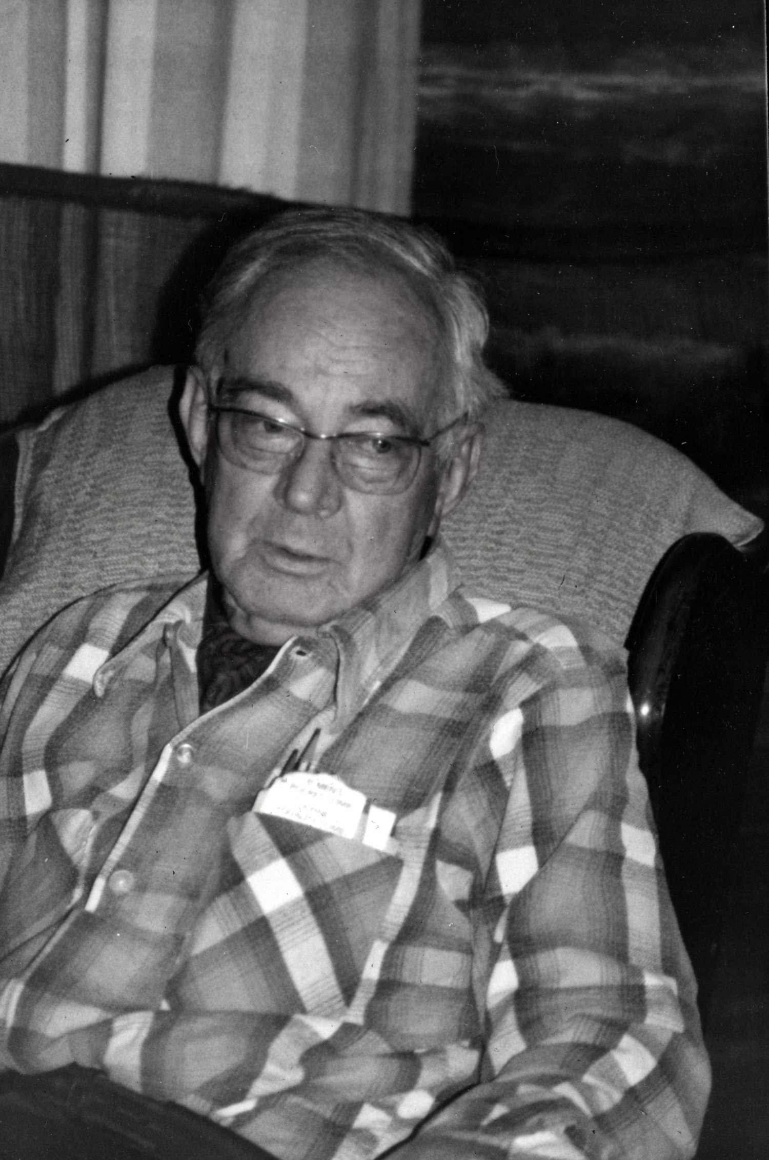 - Burton Rogers seated in chair in Big Log living room. [X_100_workers_2598a_mod.jpg]