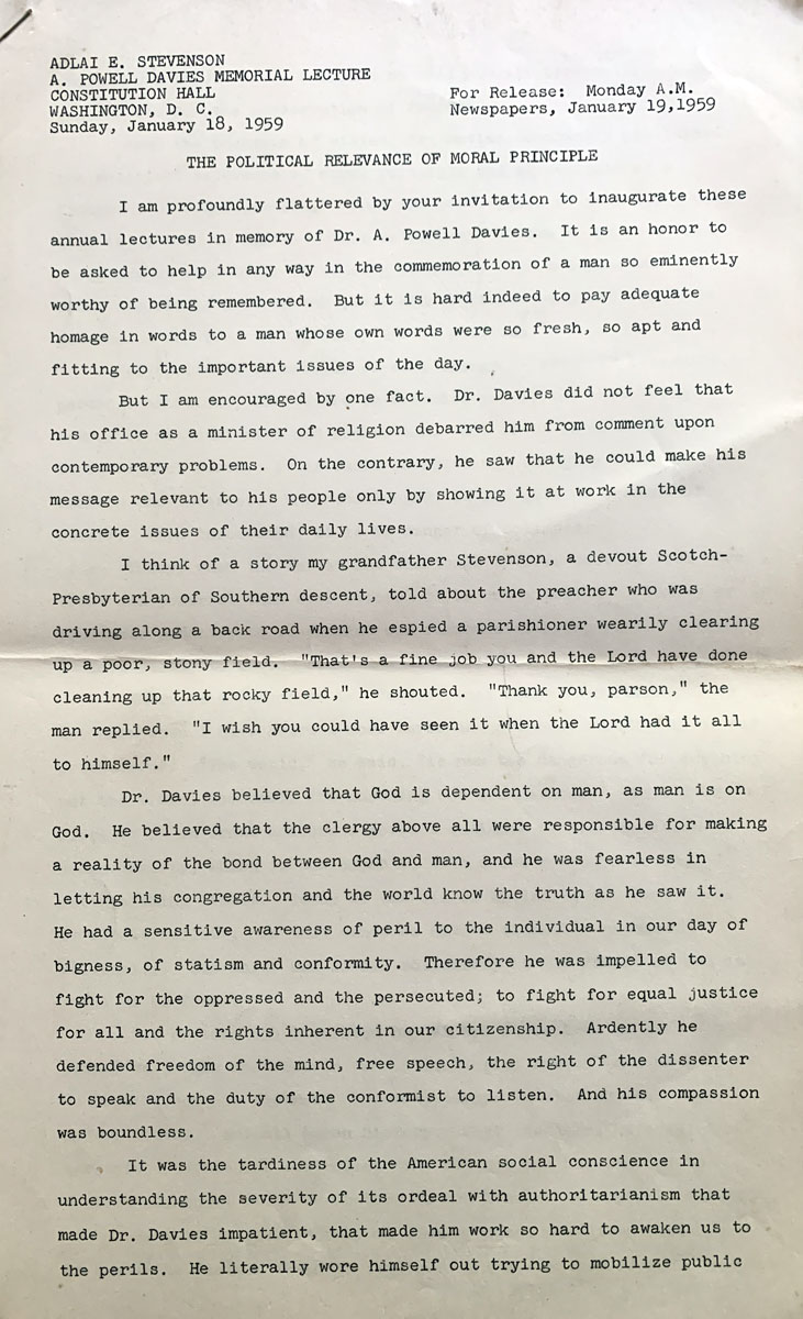 I am profoundly flattered by your invitation to inaugurate these annual lectures in memory of Dr. A. Powell Davies. It is an honor to be asked to help in any way in the commemoration of a man so eminently worthy of being remembered. But it is hard indeed to pay adequate homage in words to a man whose own words were so fresh, so apt and fitting to the important issues of the day.