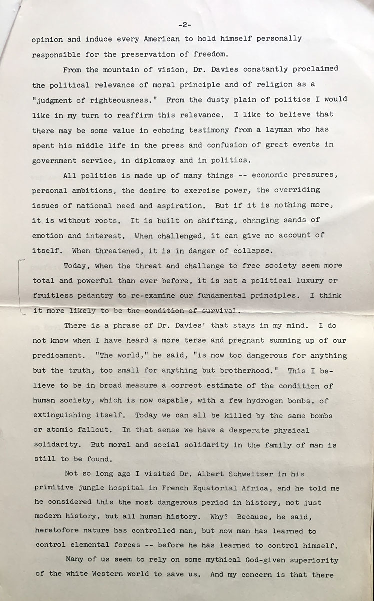 From the mountain of vision, Dr. Davies constantly proclaimed the political relevance of moral principle and of religion as a “judgment of righteousness.” From the dusty plain of politics I would like in my turn to reaffirm this relevance. I like to believe that there may be some value in echoing testimony from a layman who has spent his middle life in the press and confusion of great events in government service, in diplomacy and in politics.