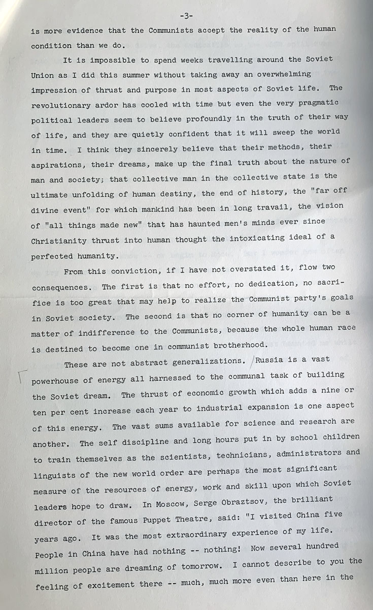 It is impossible to spend weeks travelling around the Soviet Union as I did this summer without taking away an overwhelming impression of thrust and purpose in most aspects of Soviet life. The revolutionary ardor has cooled with time but even the very pragmatic political leaders seem to believe profoundly in the truth of their way of life, and they are quietly confident that it will sweep the world in time. I think they sincerely believe that their methods, their aspirations, their dreams, make up the final truth about the nature of man and society; that collective man in the collective state is the ultimate unfolding of human destiny, the end of history, the “far off divine event” for which mankind has been in long travail, the vision of “all things made new” that has haunted men’s minds ever since Christianity thrust into human thought the intoxicating ideal of a perfected humanity.