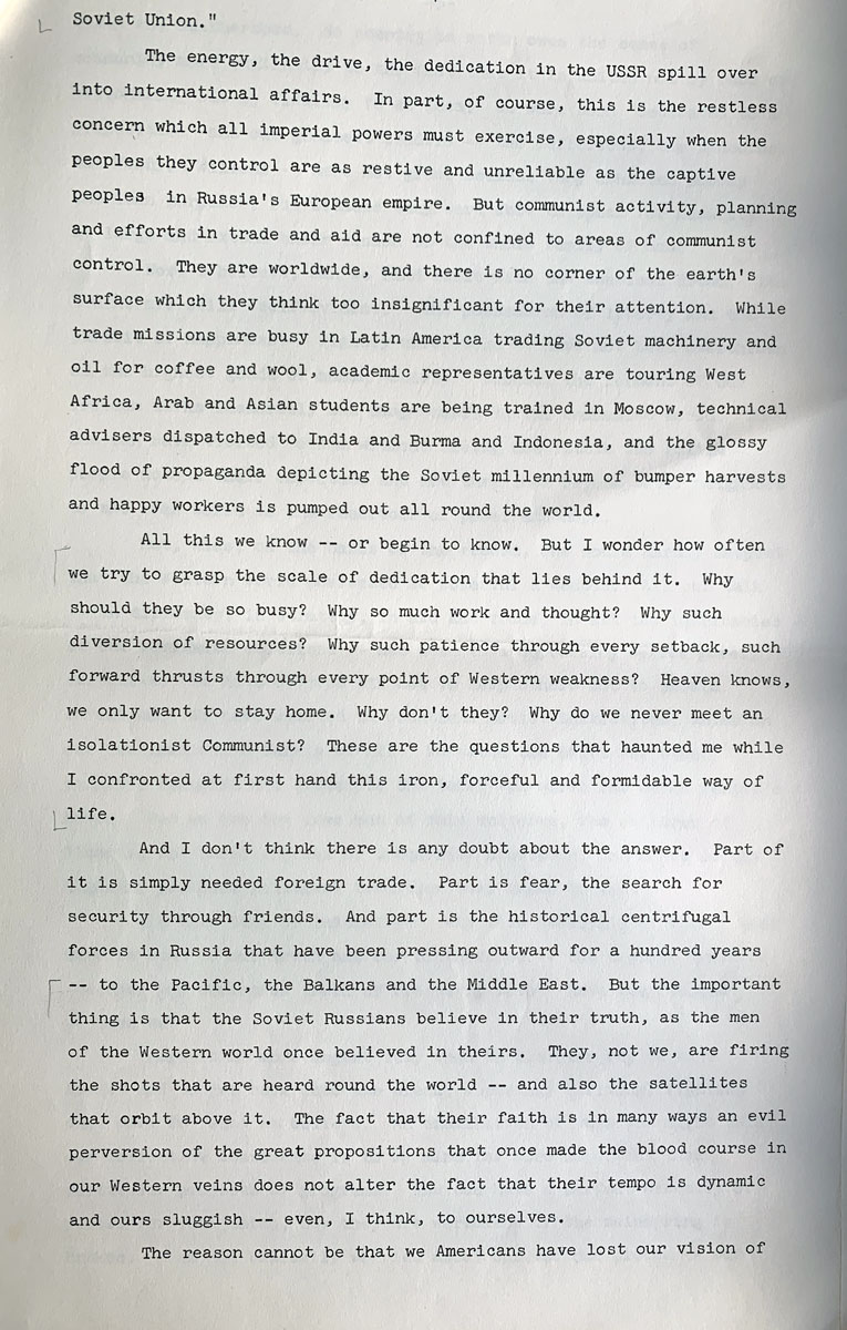 And I don’t think there is any doubt about the answer. Part of it is simply needed foreign trade. Part is fear, the search for security through friends. And part is the historical centrifugal forces in Russia that have been pressing outward for a hundred years — to the Pacific, the Balkans and the Middle East. But the important thing is that the Soviet Russians believe in their truth, as the men of the Western world once believed in theirs. They, not we, are firing the shots that are heard round the world — and also the satellites that orbit above it. The fact that their faith is in many ways an evil perversion of the great propositions that once made the blood course in our Western veins does not alter the fact that their tempo is dynamic and ours sluggish — even, I think, to ourselves.
