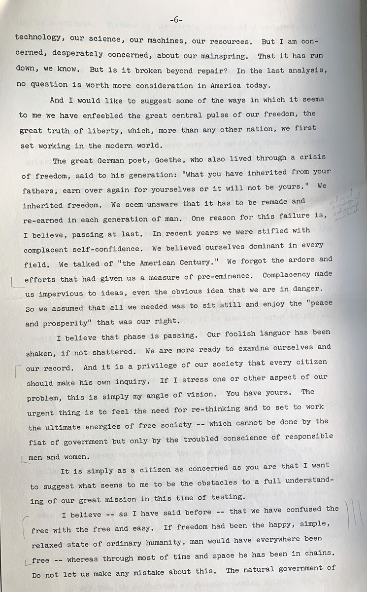 The great German poet, Goethe, who also lived through a crisis of freedom, said to his generation: “What you have inherited from your fathers, earn over again for yourselves or it will not be yours.” We inherited freedom. We seem unaware that it has to be remade and re-earned in each generation of man. One reason for this failure is, I believe, passing at last. In recent years we were stifled with complacent self-confidence. We believed ourselves dominant in every field. We talked of “the American Century.” We forgot the ardors and efforts that had given us a measure of pre-eminence. Complacency made us impervious to ideas, even the obvious idea that we are in danger. So we assumed that all we needed was to sit still and enjoy the “peace and prosperity” that was our right.