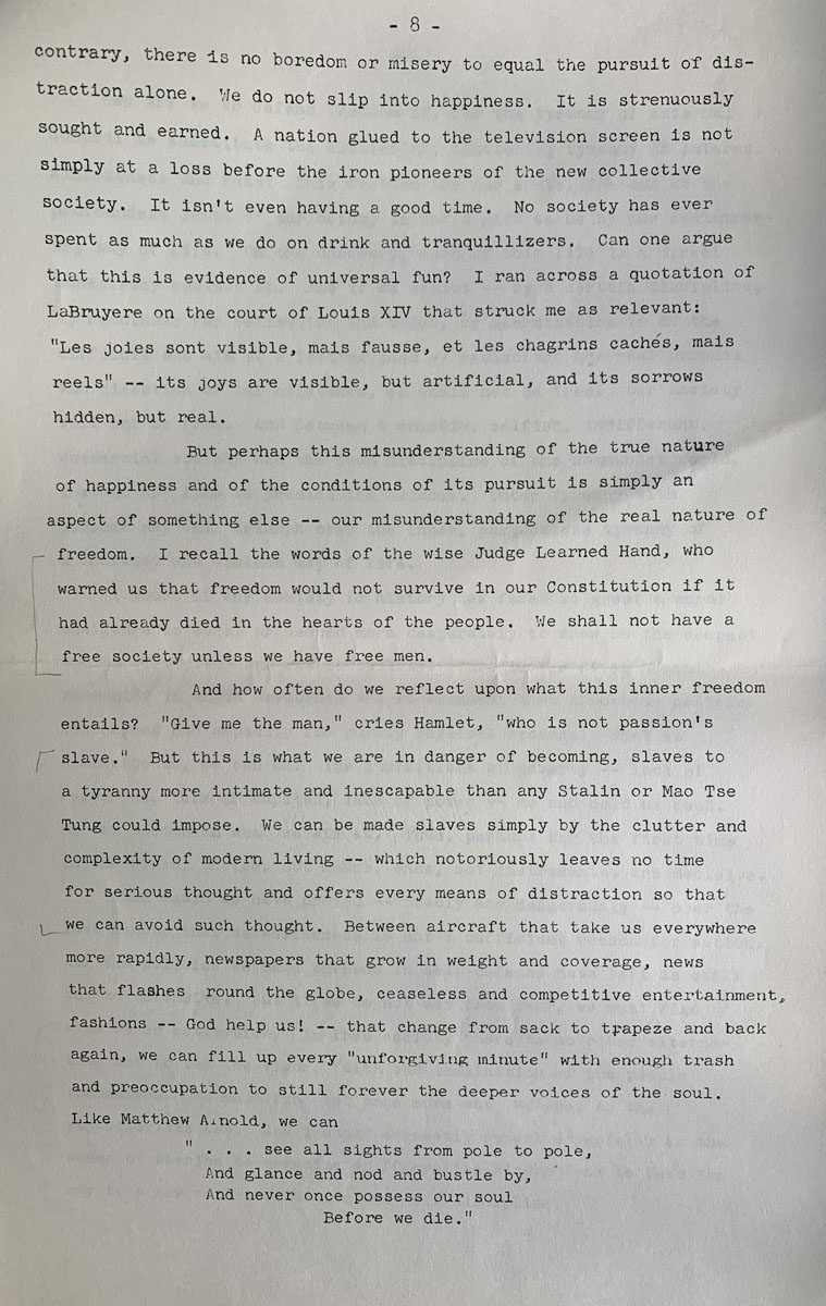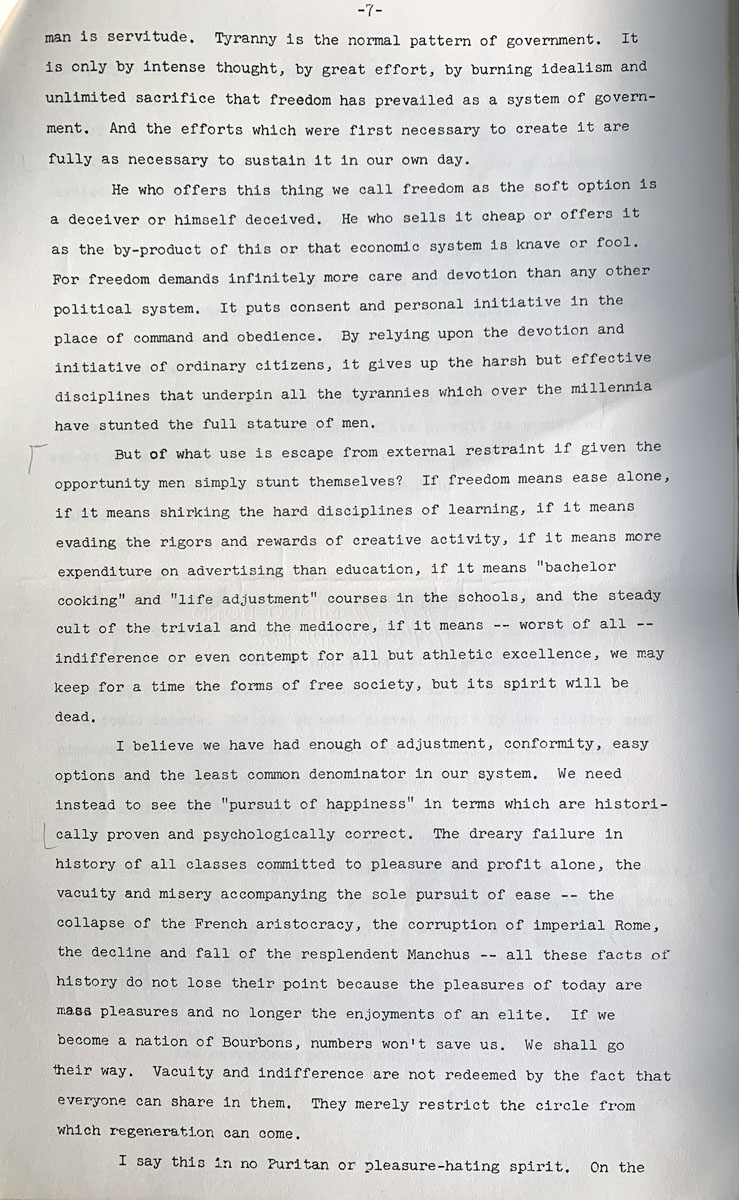 I believe we have had enough of adjustment, conformity, easy options and the least common denominator in our system. We need instead to see the “pursuit of happiness” in terms which are historically proven and psychologically correct. The dreary failure in history of all classes committed to pleasure and profit alone, the vacuity and misery accompanying the sole pursuit of ease — the collapse of the French aristocracy, the corruption of imperial Rome, the decline and fall of the resplendent Manchus — all these facts of history do not lose their point because the pleasures of today are mass pleasures and no longer the enjoyments of an elite. If we become a nation of Bourbons, numbers won’t save us. We shall go their way. Vacuity and indifference are not redeemed by the fact that everyone can share in them. They merely restrict the circle from which regeneration can come.