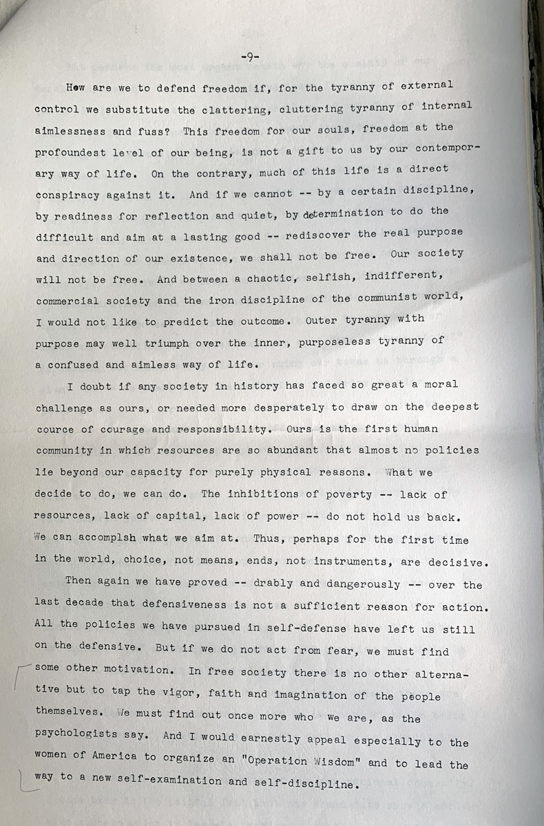 Then again we have proved — drably and dangerously — over the last decade that defensiveness is not a sufficient reason for action. All the policies we have pursued in self-defense have left us still on the defensive. But if we do not act from fear, we must find some other motivation. In free society there is no other alternative but to tap the vigor, faith and imagination of the people themselves. We must find out once more who we are, as the psychologists say. And I would earnestly appeal especially to the women of America to organize an “Operation Wisdom” and to lead the way to a new self-examination and self-discipline.
