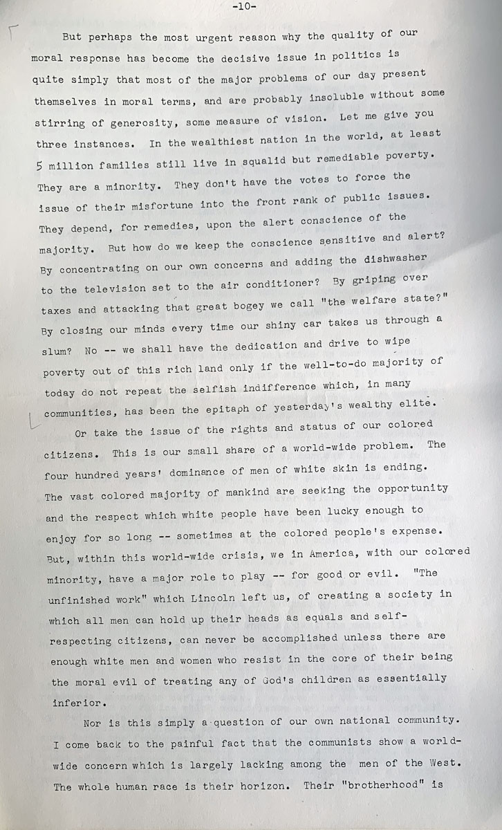 But perhaps the most urgent reason why the quality of our moral response has become the decisive issue in politics is quite simply that most of the major problems of our day present themselves in moral terms and are probably insoluble without some stirring of generosity, some measure of vision. Let me give you three instances. In the wealthiest nation in the world, at least 5 million families still live in squalid but remediable poverty. They are a minority. They don’t have the votes to force the issue of their misfortune into the front rank of public issues. They depend, for remedies, upon the alert conscience of the majority. But how do we keep the conscience sensitive and alert? By concentrating on our own concerns and adding the dishwasher to the television set to the air conditioner? By griping over taxes and attacking that great bogey we call “the welfare state?” By closing our minds every time our shiny car takes us through a slum? NO — we shall have the dedication and drive to wipe poverty out of this rich land only if the well-to-do majority of today do not repeat the selfish indifference which, in many communities, has been the epitaph of yesterday’s wealthy elite.