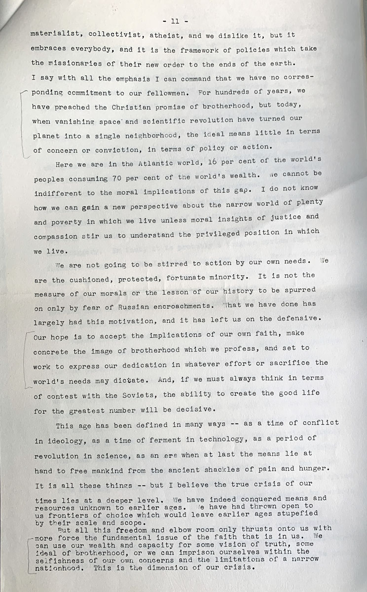 We are not going to be stirred to action by our own needs. We are the cushioned, protected, fortunate minority. It is not the measure of our morals or the lesson of our history to be spurred on only by fear of Russian encroachments. What we have done has largely had this motivation, and it has left us on the defensive. Our hope is to accept the implications of our own faith, make concrete the image of brotherhood which we profess, and set to work to express our dedication in whatever effort or sacrifice the world’s needs may dictate. And, if we must always think in terms of contest with the Soviets, the ability to create the good life for the greatest number will be decisive.