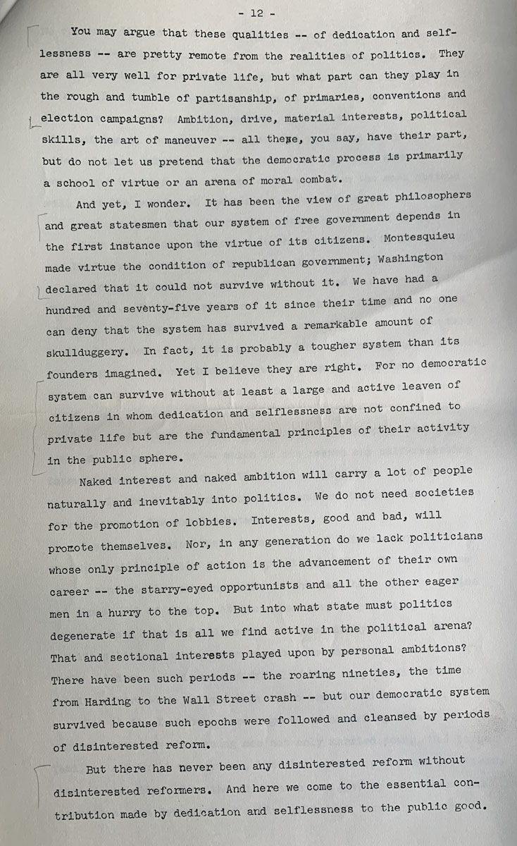 You may argue that these qualities — of dedication and selflessness — are pretty remote from the realities of politics. They are all very well for private life, but what part can they play in the rough and tumble of partisanship, of primaries, conventions and election campaigns? Ambition, drive, material interests, political skills, the art of maneuver — all these, you say, have their part, but do not let us pretend that the democratic process is primarily a school of virtue or an arena of moral combat.