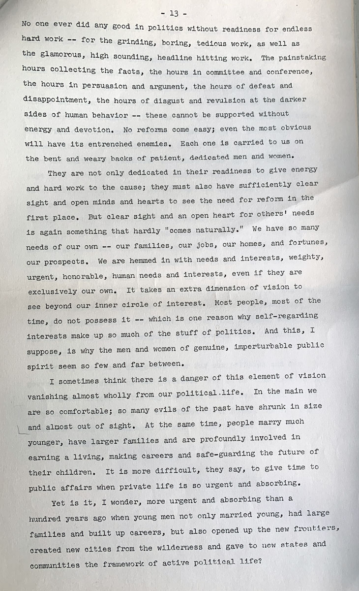 No one ever did any good in politics without readiness for endless hard work — for the grinding, boring, tedious work, as well as the glamorous, high sounding, headline hitting work. The painstaking hours collecting the facts, the hours in committee and conference, the hours in persuasion and argument, the hours of defeat and disappointment, the hours of disgust and revulsion at the darker sides of human behavior — these cannot be supported without energy and devotion. No reforms come easy; even the most obvious will have its entrenched enemies. Each one is carried to us on the bent and weary backs of patient, dedicated men and women.