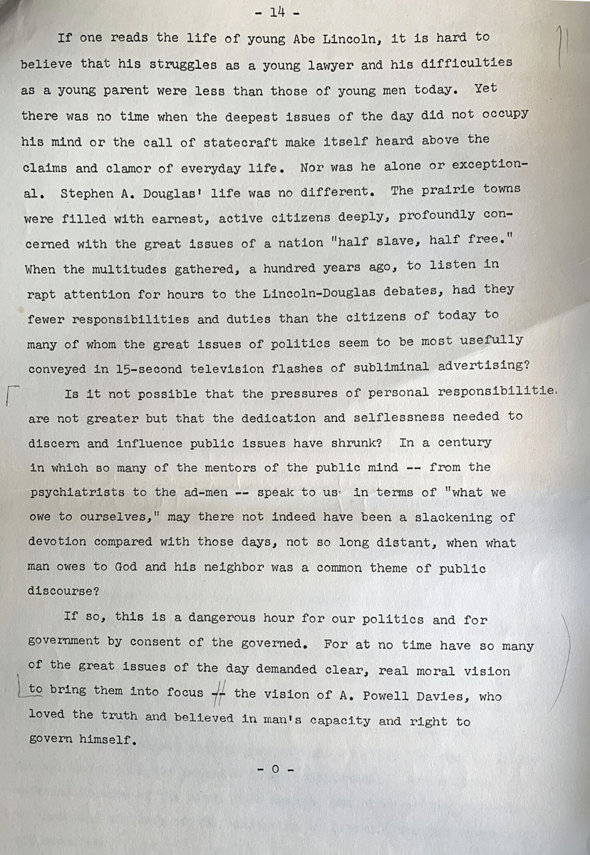 If so, this is a dangerous hour for our politics and for government by consent of the governed. For at no time have so many of the great issues of the day demanded clear, real moral vision to bring them into focus — the vision of A. Powell Davies, who loved the truth and believed in man’s capacity and right to govern himself.