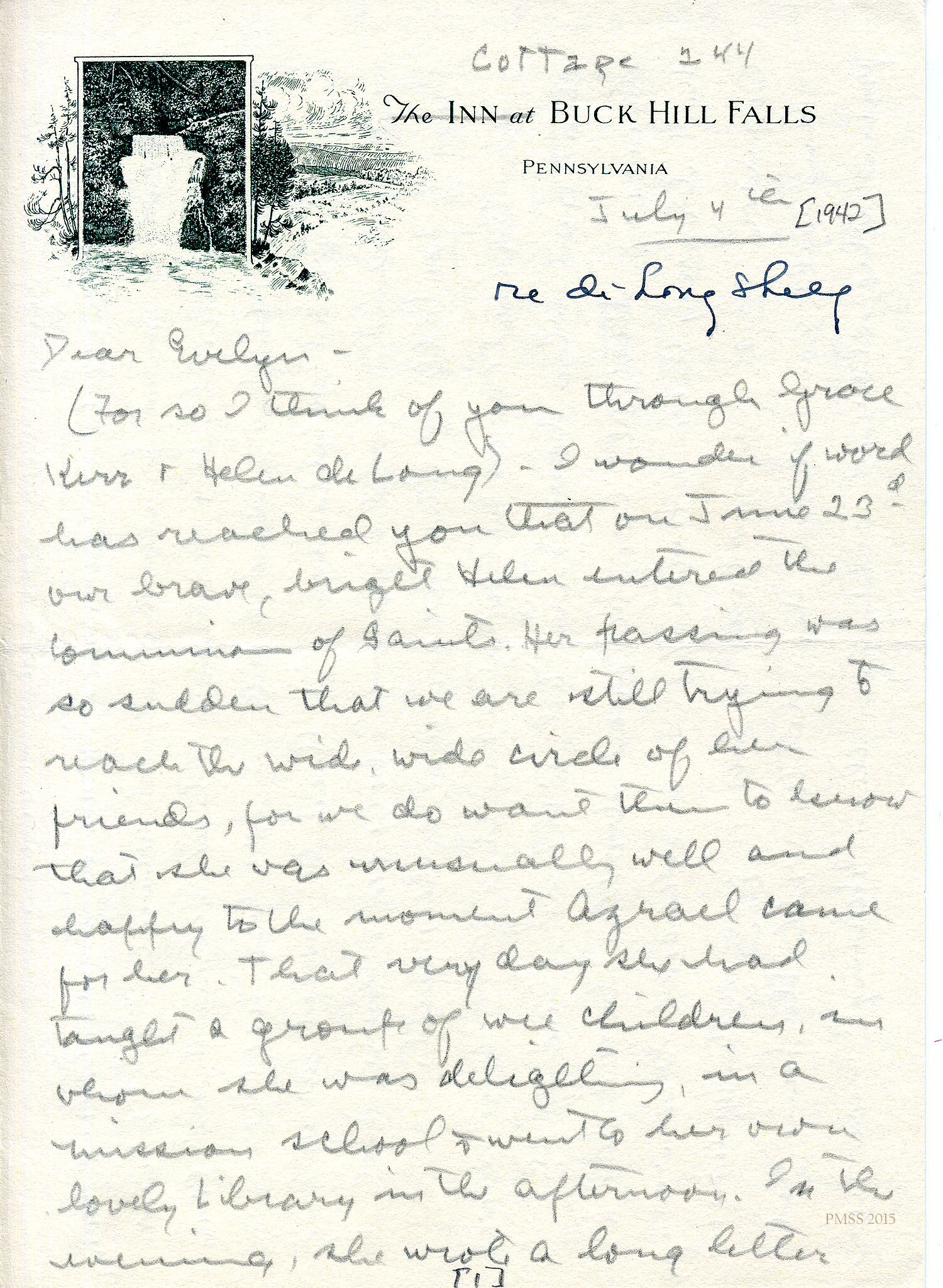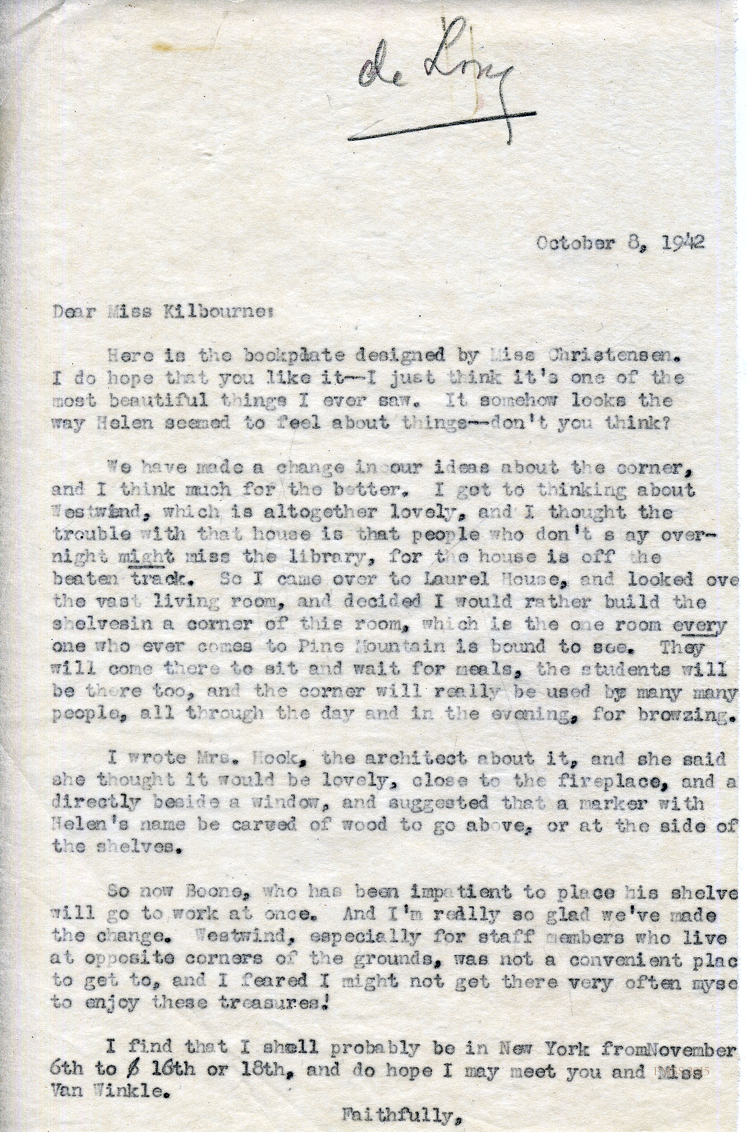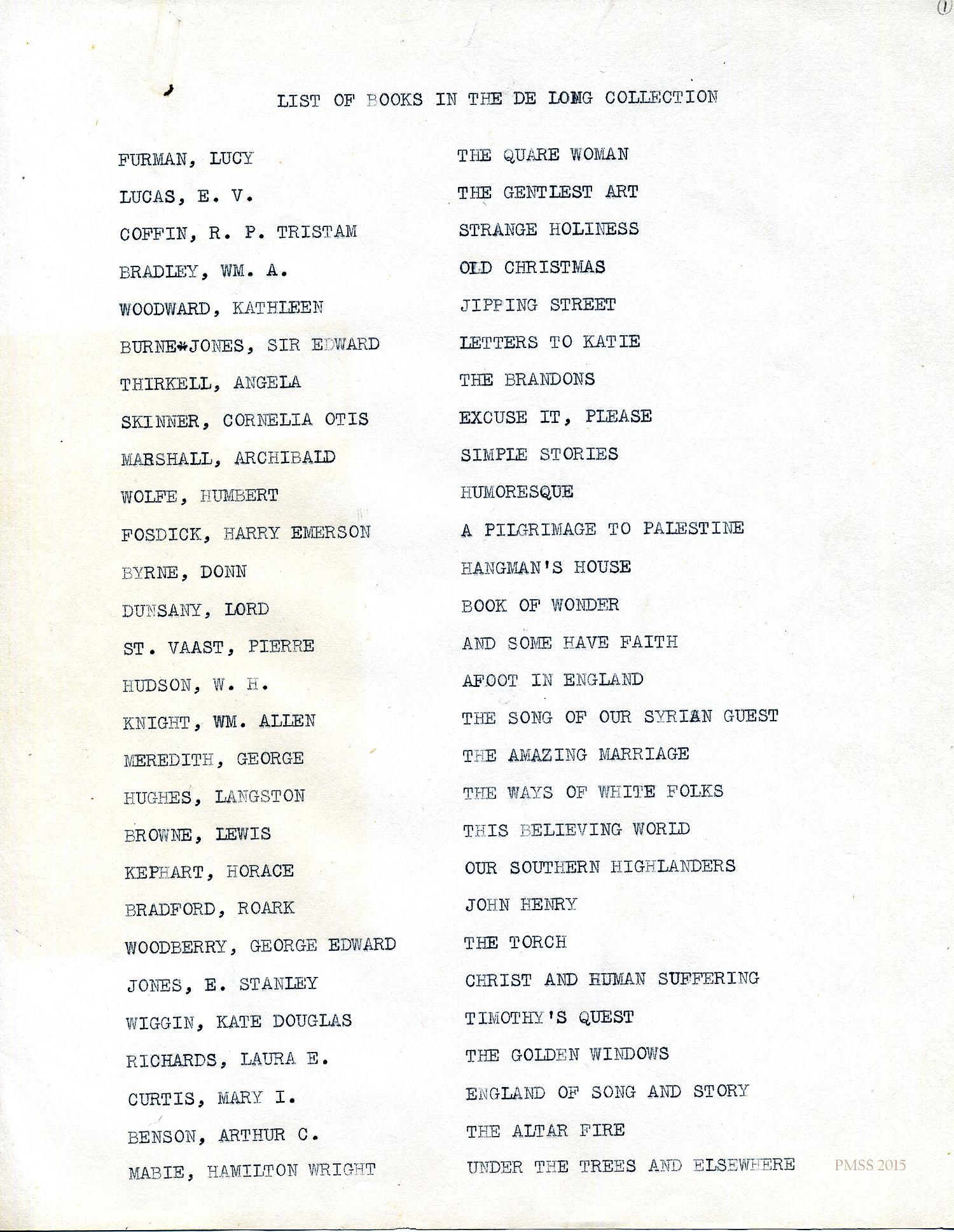 In the Fall of 2015 an inventory of the Helen de Long Donation was done and an attempt was made to identify books representing the initial donation. Only items identified by book-plate or association were aggregated for the following list. The total count was around 72 books, only a fraction of the original donation. Clearly many of the original books in the 350+ collection had been removed to the general book holdings at Pine Mountain and expect to be identified when the final inventory of SPECIAL AND APPALACHIAN BOOKS is completed. They will then be identified in the general database as DE LONG DONATIONS.
