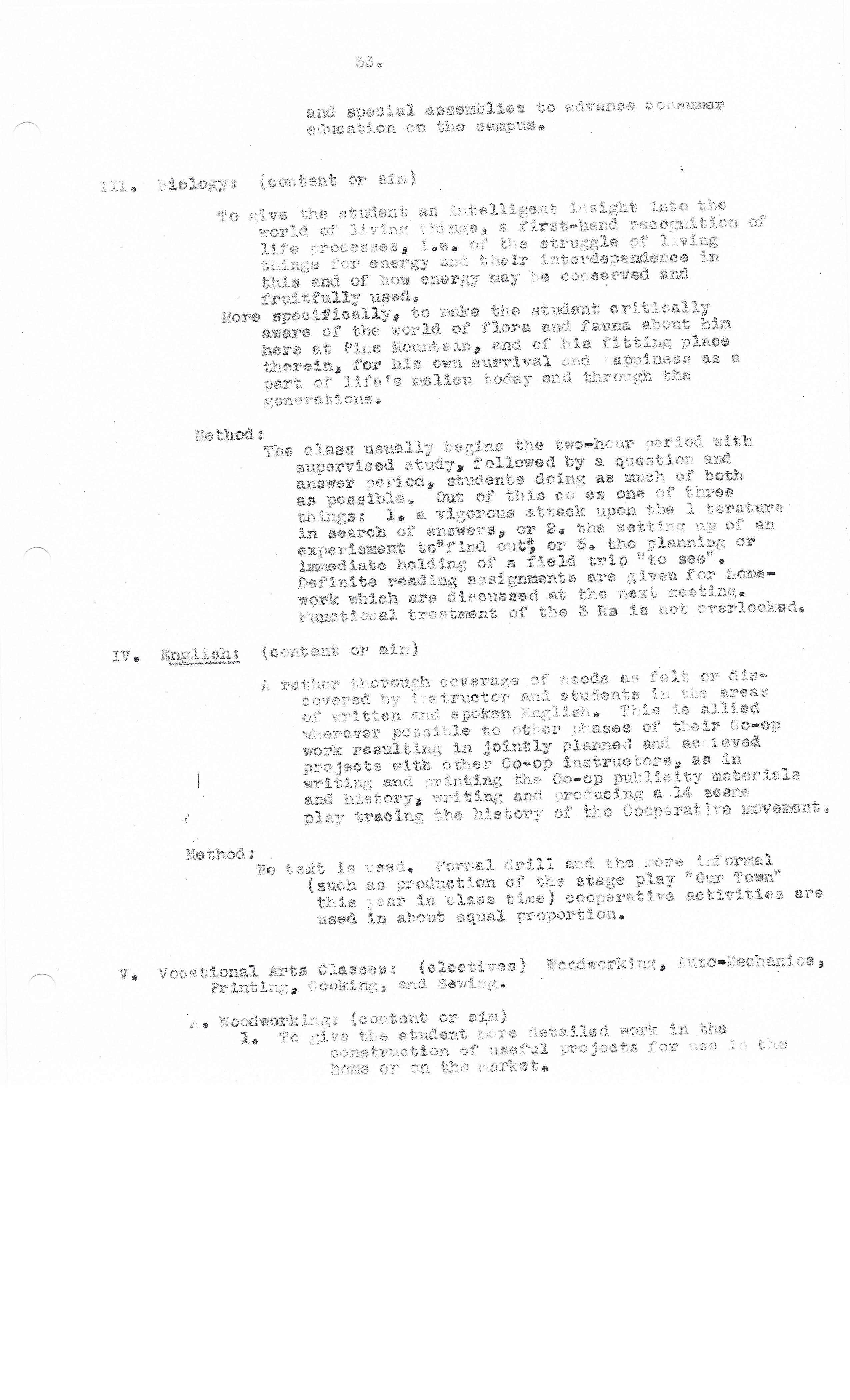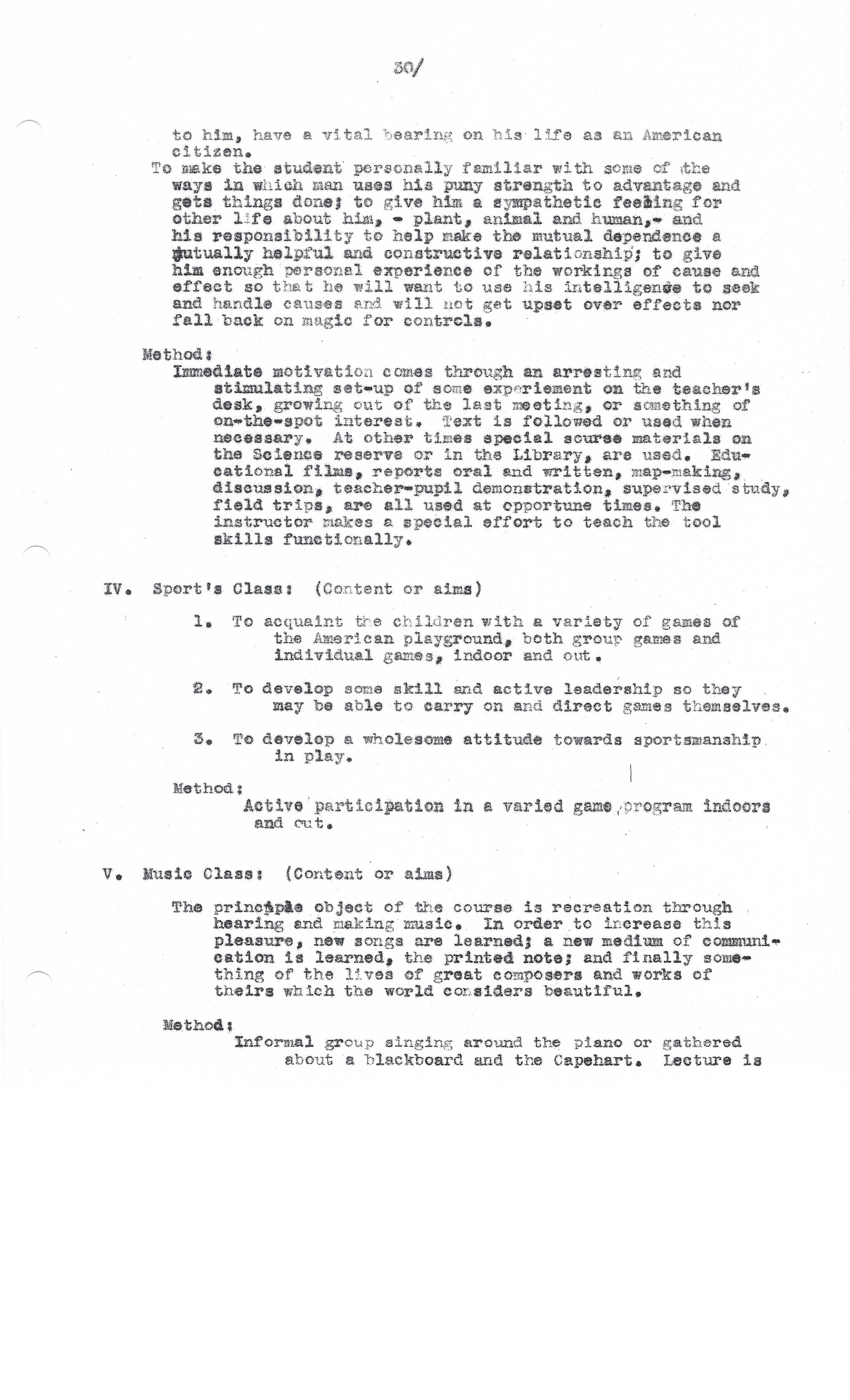 Immediate motivation comes through an arresting and stimulating set-up of some experiment on the teacher’s desk, growing out of the last meeting, or something of on-the-spot interest. Text is followed or used when necessary. All other times special source materials on the Science reserve or in the LIbrary, are used. Educational films, reports oral and written, map-making, discussion, teacher-pupil demonstration, supervised study, field trips, are all used at opportune times. The instructor makes a special effort to teach the tool skills functionally.