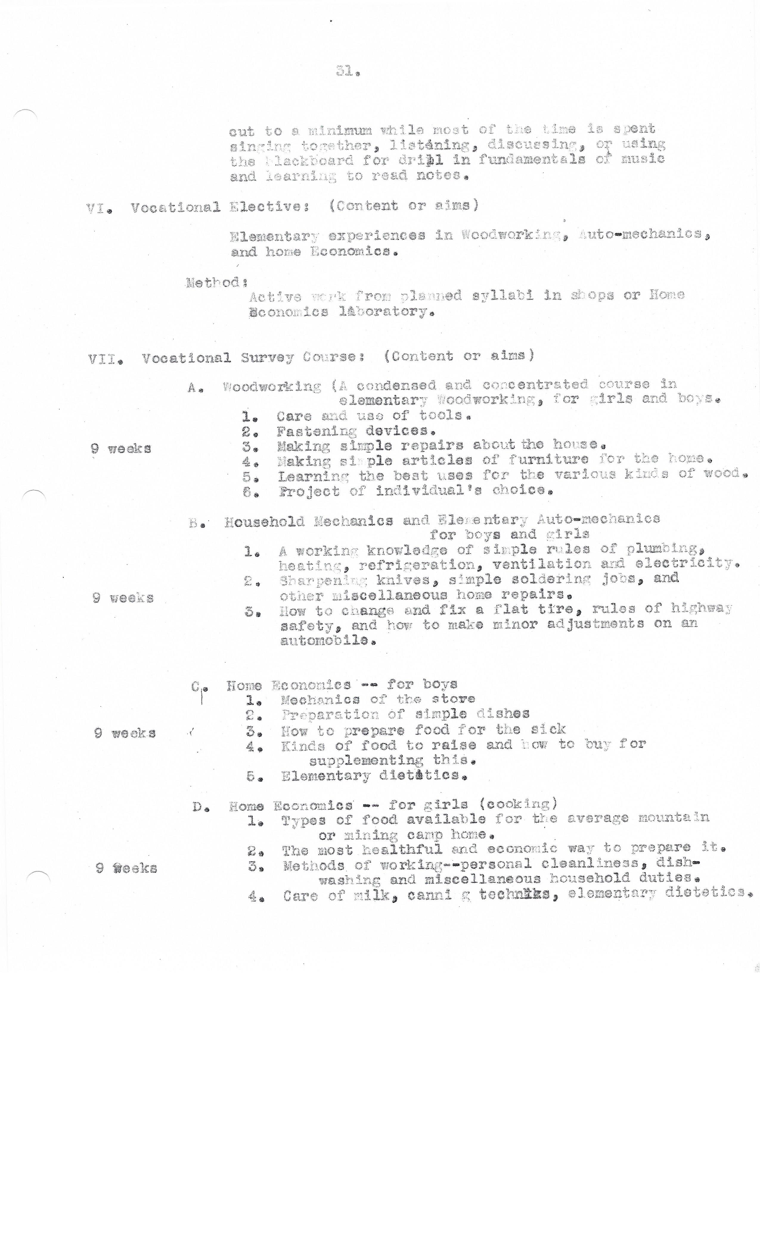 The emphasis is placed on repairs and construction of useful projects which will tend to improve home life. Instruction and practice in use of lathe, joiner, planer and cabinet work for more advanced students.