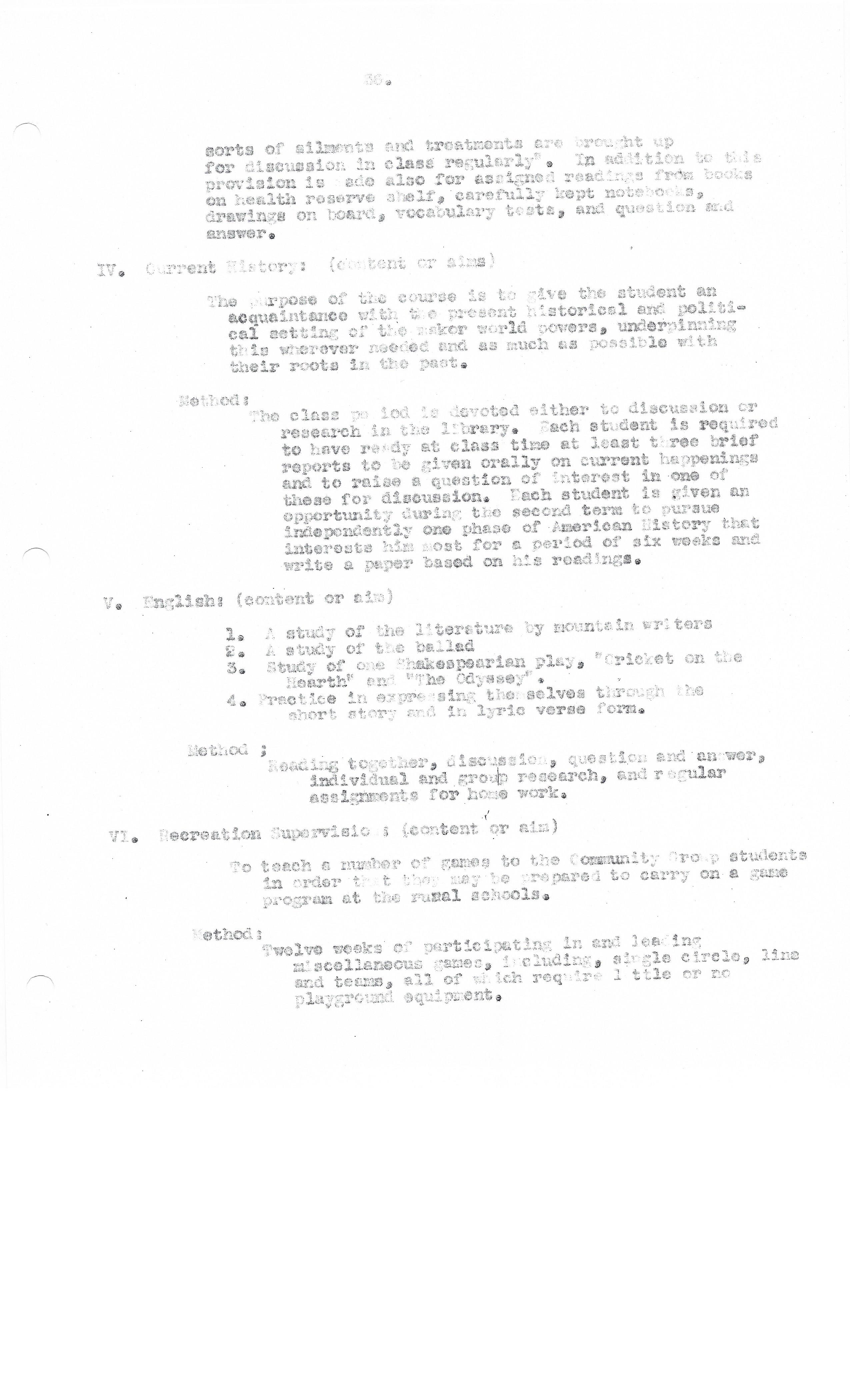 The class period is devoted either to discussion or research in the library. Each student is required to have ready at class time at least three brief reports to be given orally on current happenings and to raise a question of interest in one of these for discussion. Each student is given an opportunity during the second term to pursue independently one phase of American History that interests him most for a period of six weeks and write a paper based on his readings.