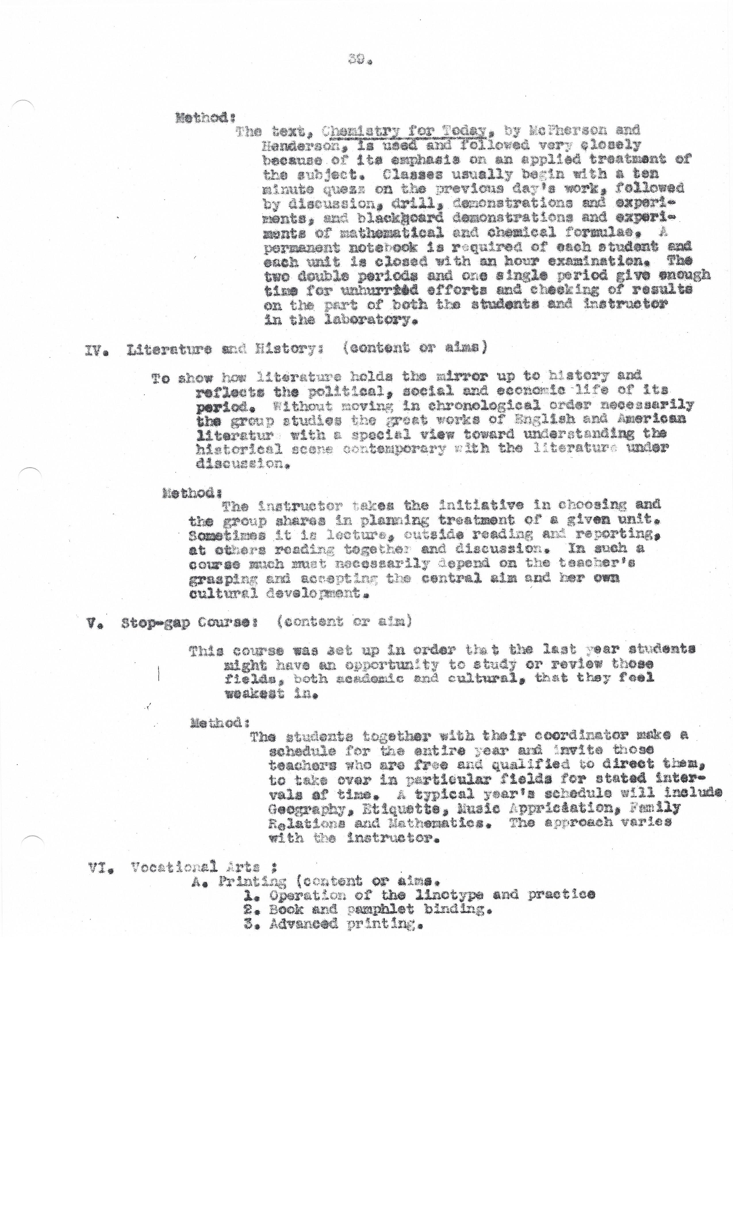To give to the seniors the experience of a course in Applied Chemistry which is not mere opinion, speculation and discussion, but is exact, rigorous and rewarding. In particular, to give the girls going in for nurse’s training a substantial boost toward success in the more abstract chemistry course they will encounter in their first year of training; and to give to the future farmers, mechanics and housewives a familiarity with the chemicals and chemical processes which they are using, and will use.