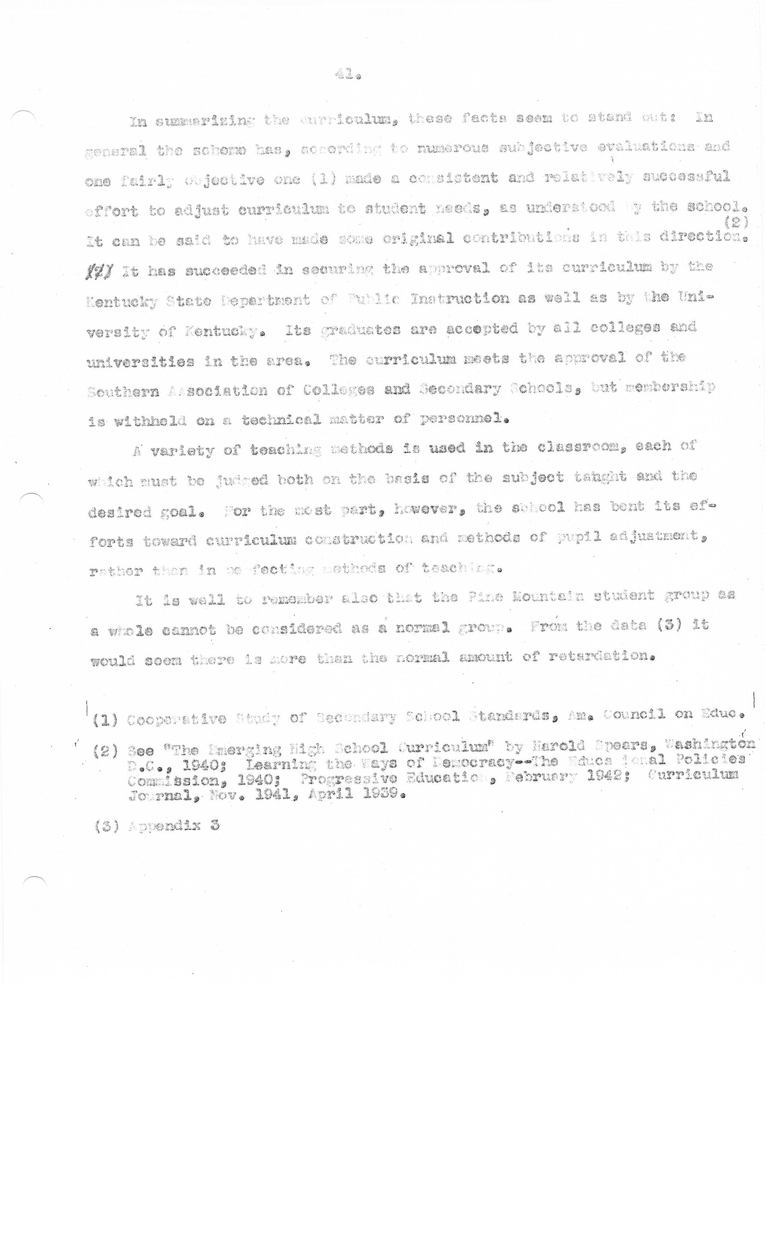In summarizing the curriculum, these facts seem to stand out: In general, the scheme has, according to numerous subjective evaluations and one fairly objective one(1), made a consistent and relatively successful effort to adjust curriculum to student needs, as understood by the School. It can be said to have made some original contributions in this direction(2). It has succeeded in securing this approval of its curriculum by the Kentucky State Department of Public Instruction, as well as by the University of Kentucky. Its graduates are accepted by all colleges and universities in the area. The curriculum meets the approval of the Southern Association of Colleges and Secondary Schools, but membership is withheld on a technical matter of personnel.