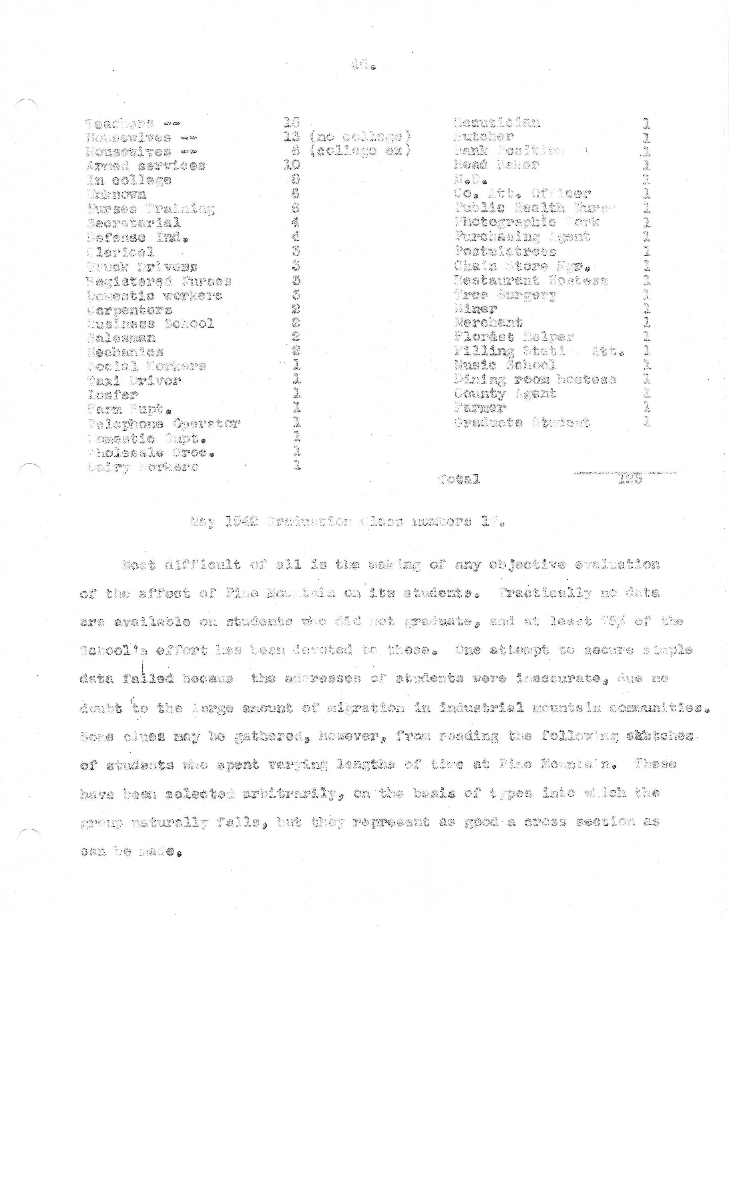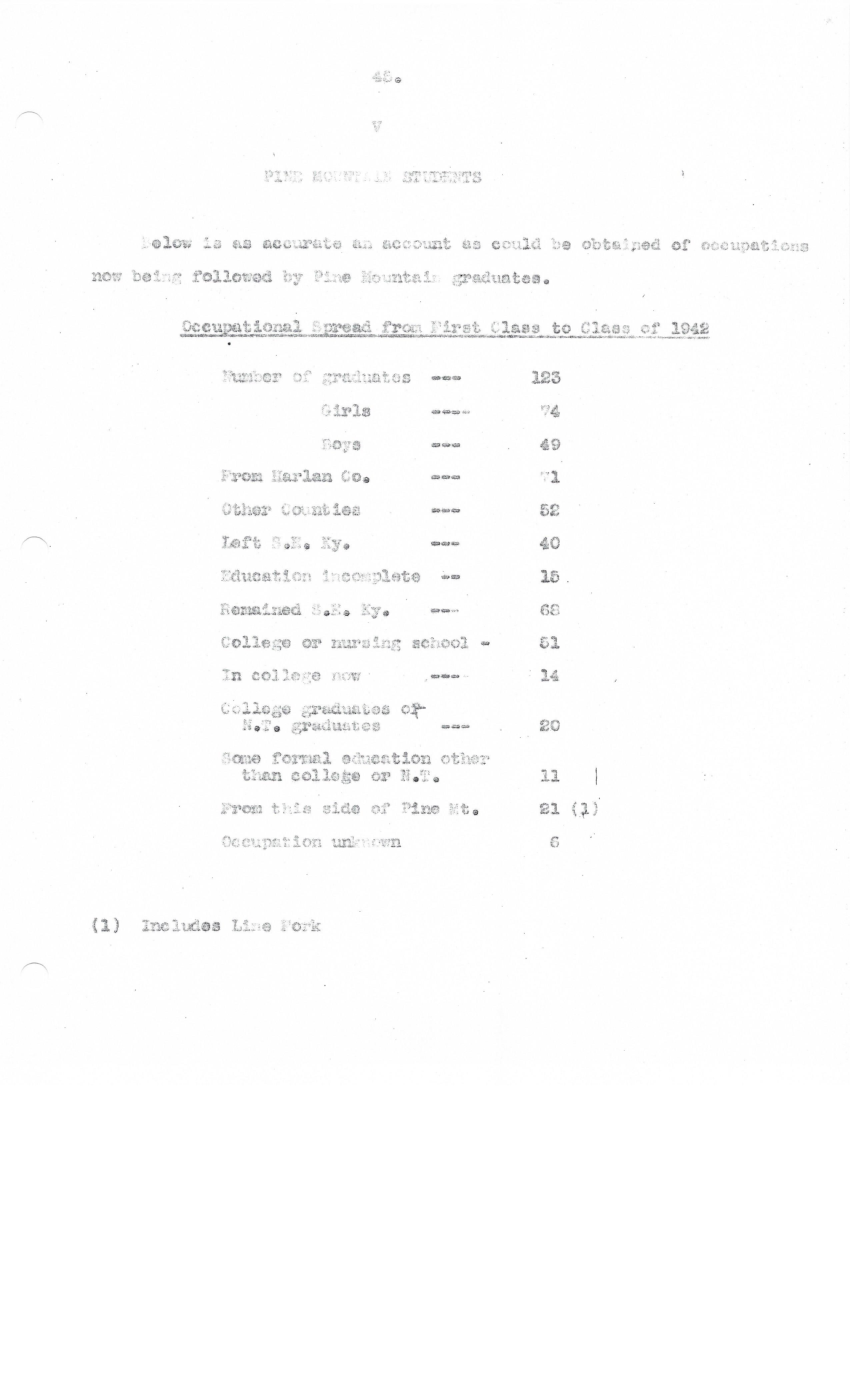 TAGS: Glyn Morris Study & Recommendations V Students; Pine Mountain Settlement School; Harlan County, KY; PMSS students; education; educational study; institutional reports; Class of 1942; institutional history ; occupational statistics ; graduates; non-graduates; coal camps; student community project; Berea College; nursing; farm managers;