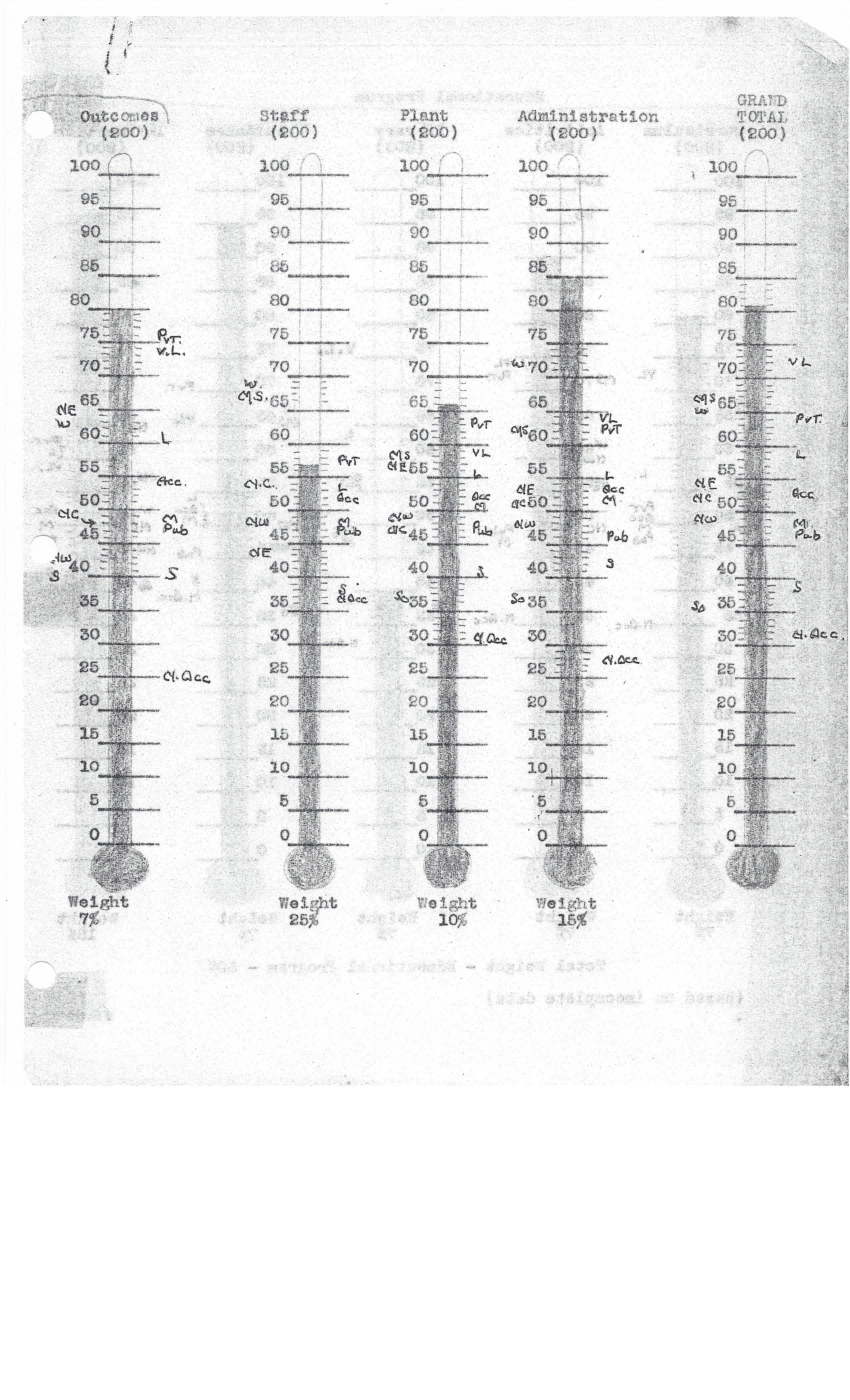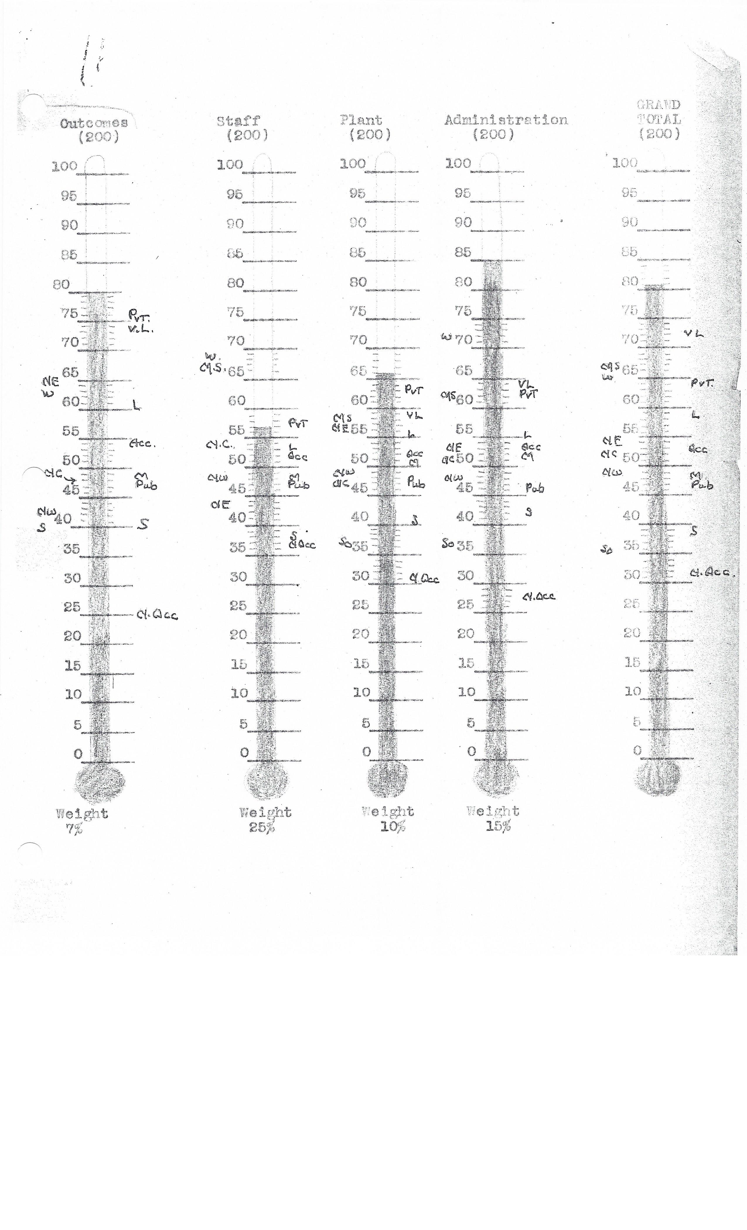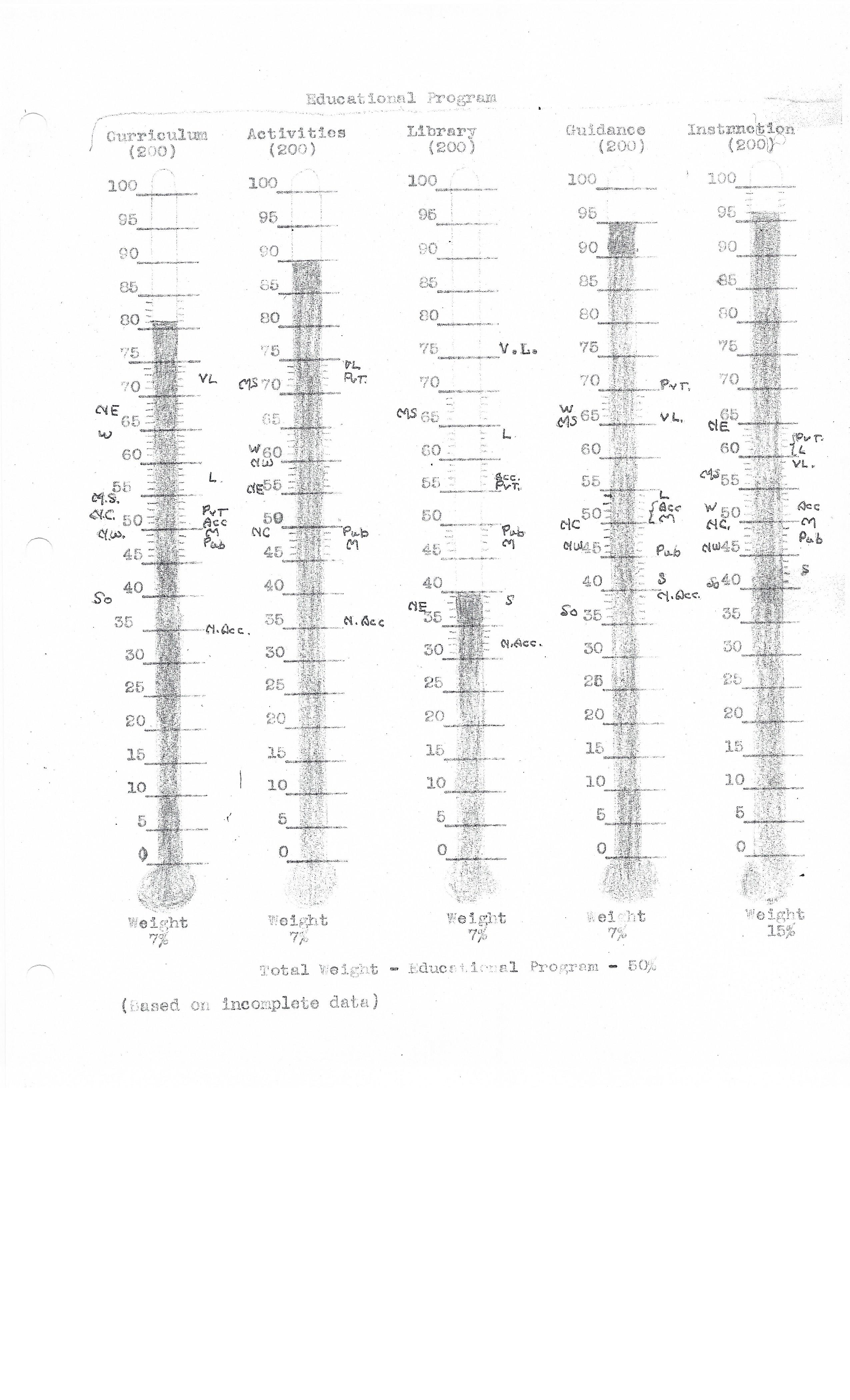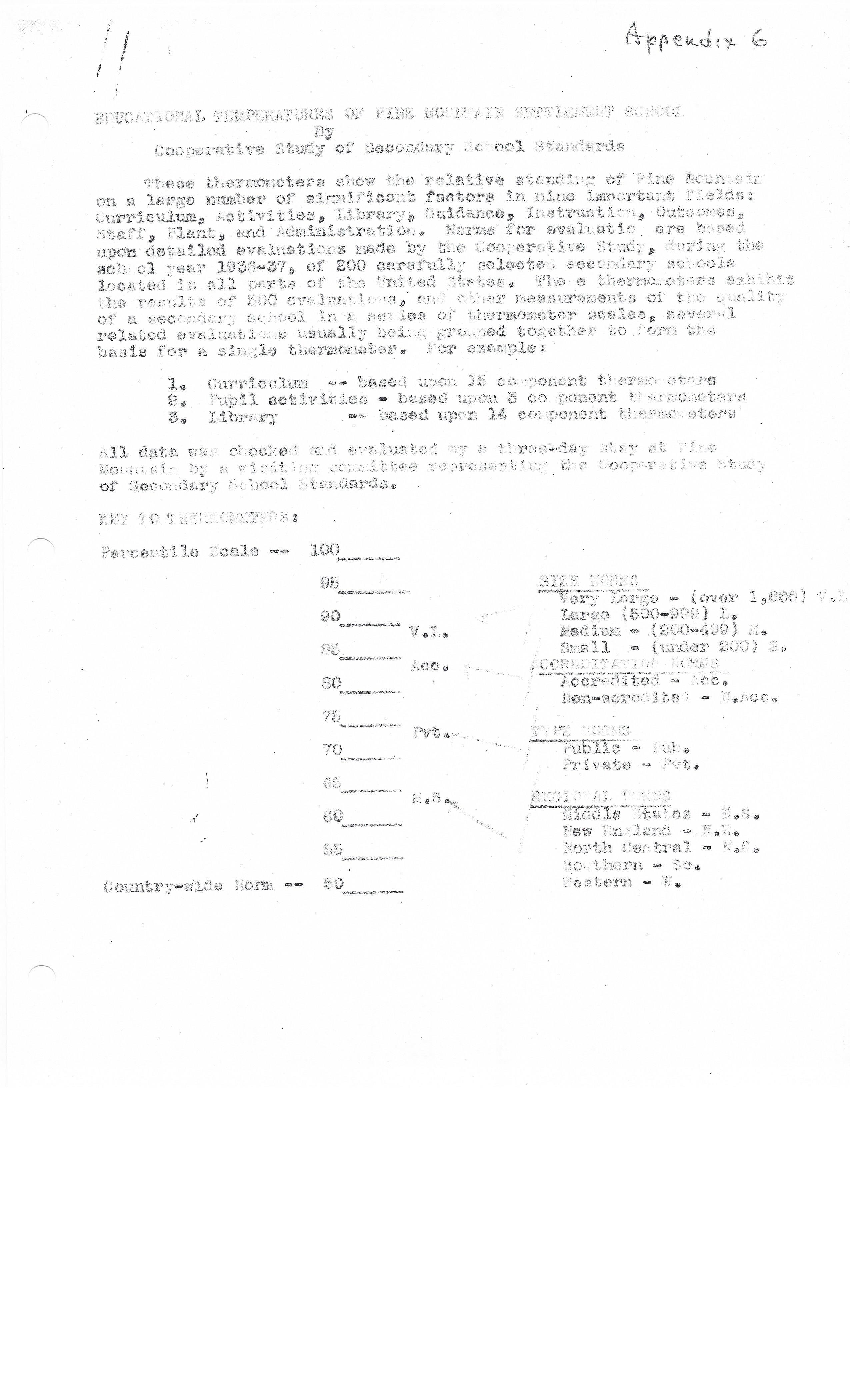 These thermometers show the relative standing of Pine Mountain on a large number of significant factors in nine important fields: Curriculum, Activities, Library, Guidance, Instruction, Outcomes, Staff, Plant, and Administration. Norms for evaluation are based upon detailed evaluations made by the Cooperative Study, during the school year 1936-37, of 200 carefully selected secondary schools located in all parts of the United States. These thermometers exhibit the results of 300 [500?] evaluations, and other measurements of the quality of a secondary school in a series of thermometer scales, several related evaluations usually being groups together to form the basis for a single thermometer. For example: