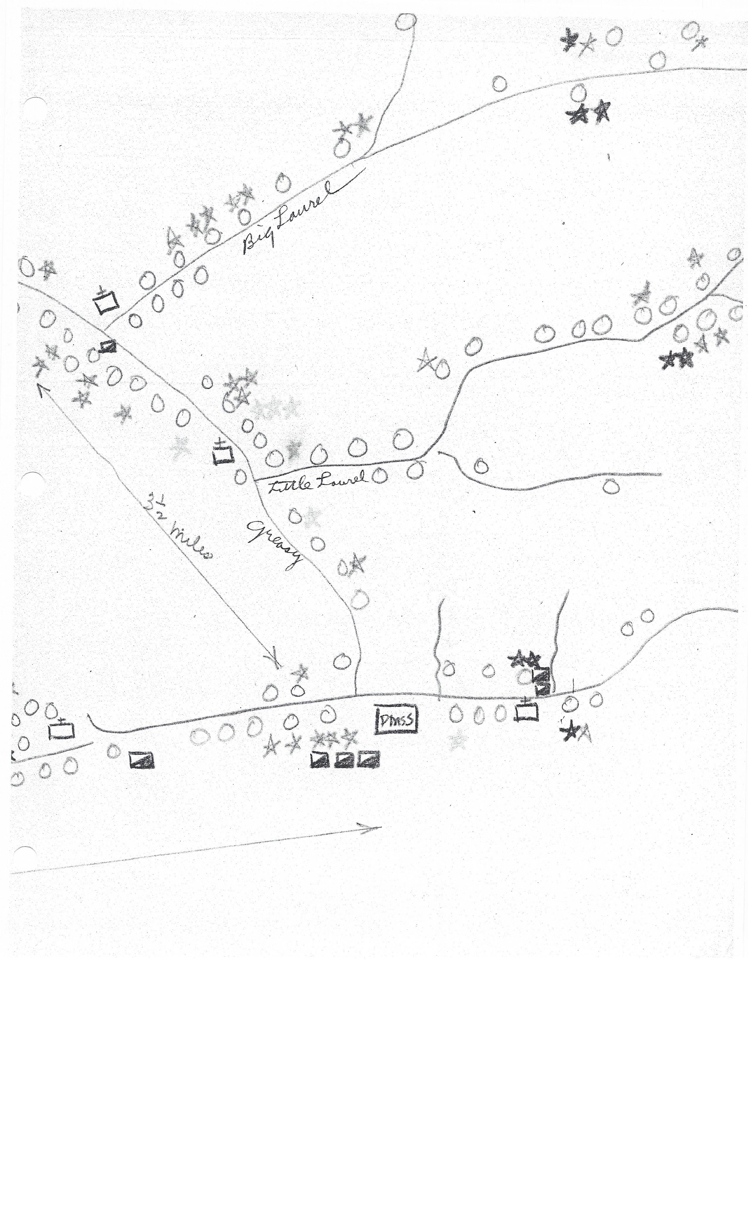 [Pencil sketch of map with symbols, showing Big Laurel, Greasy, Little Laurel, and PMSS.]