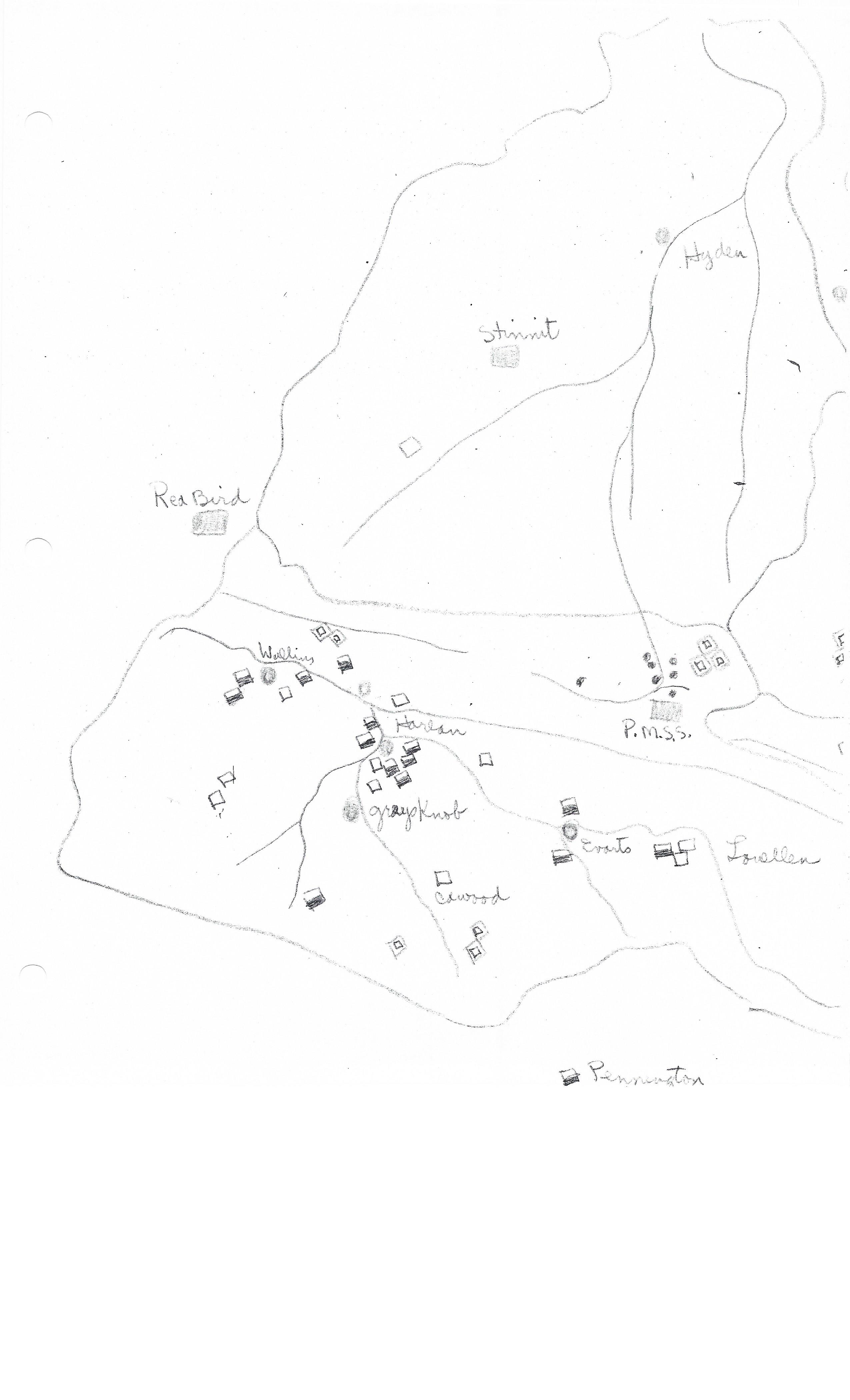 [Pencil sketch of map with symbols, showing Red Bird, Wallins, Harlan, P.M.S.S., Greys Knob, Cawood, Everts, Louellen, Pennington, Stinnit (?) and Hyden.]