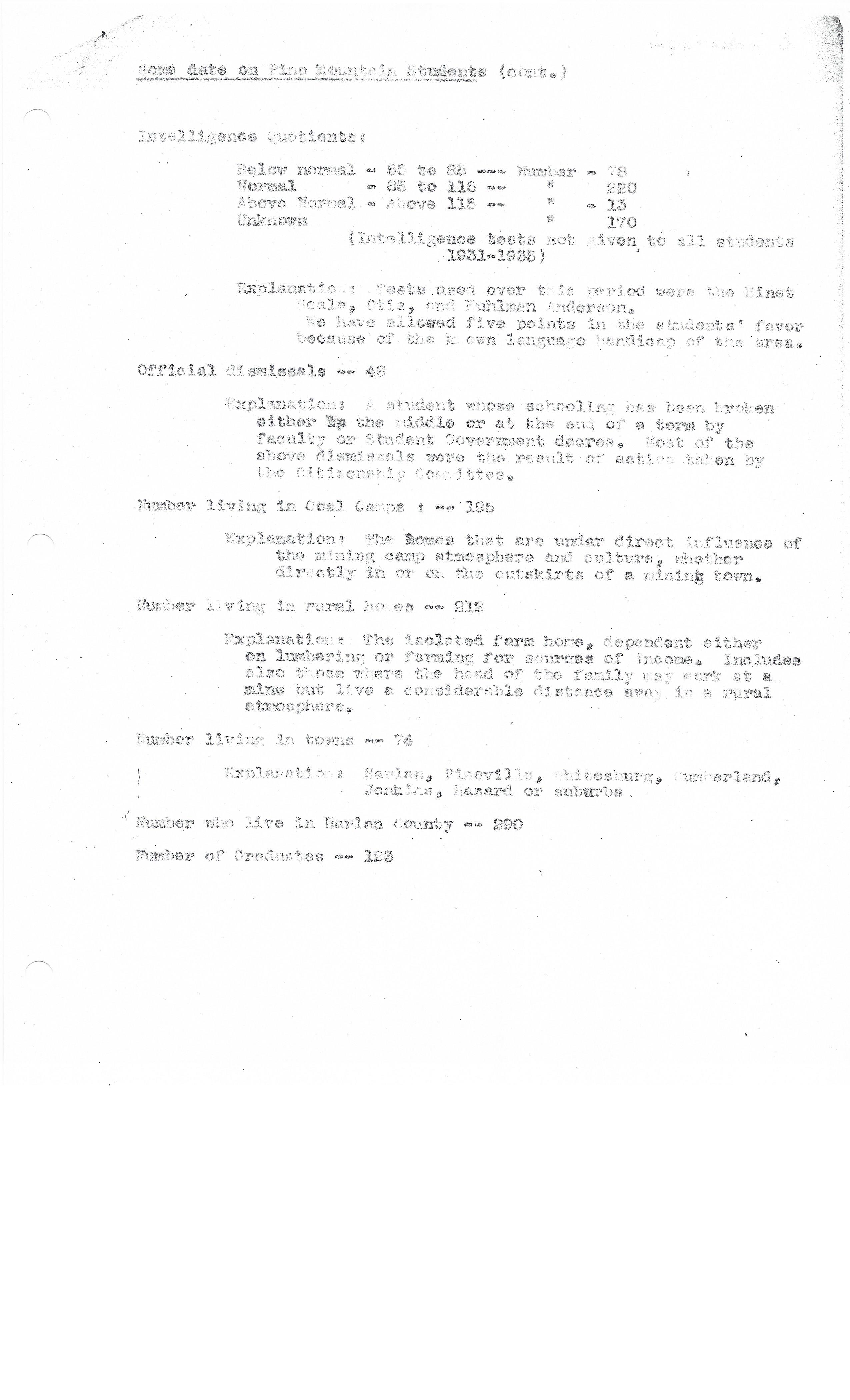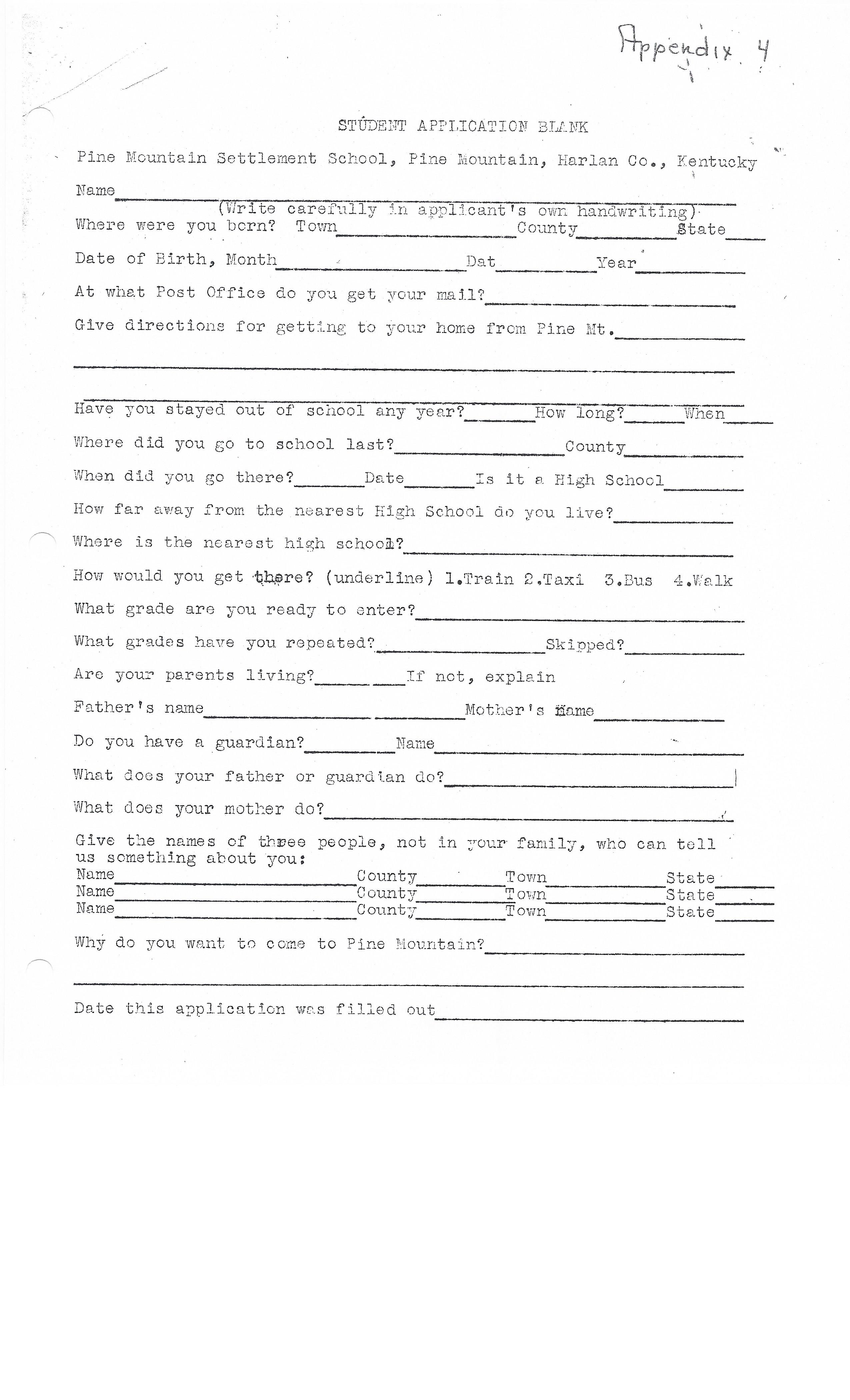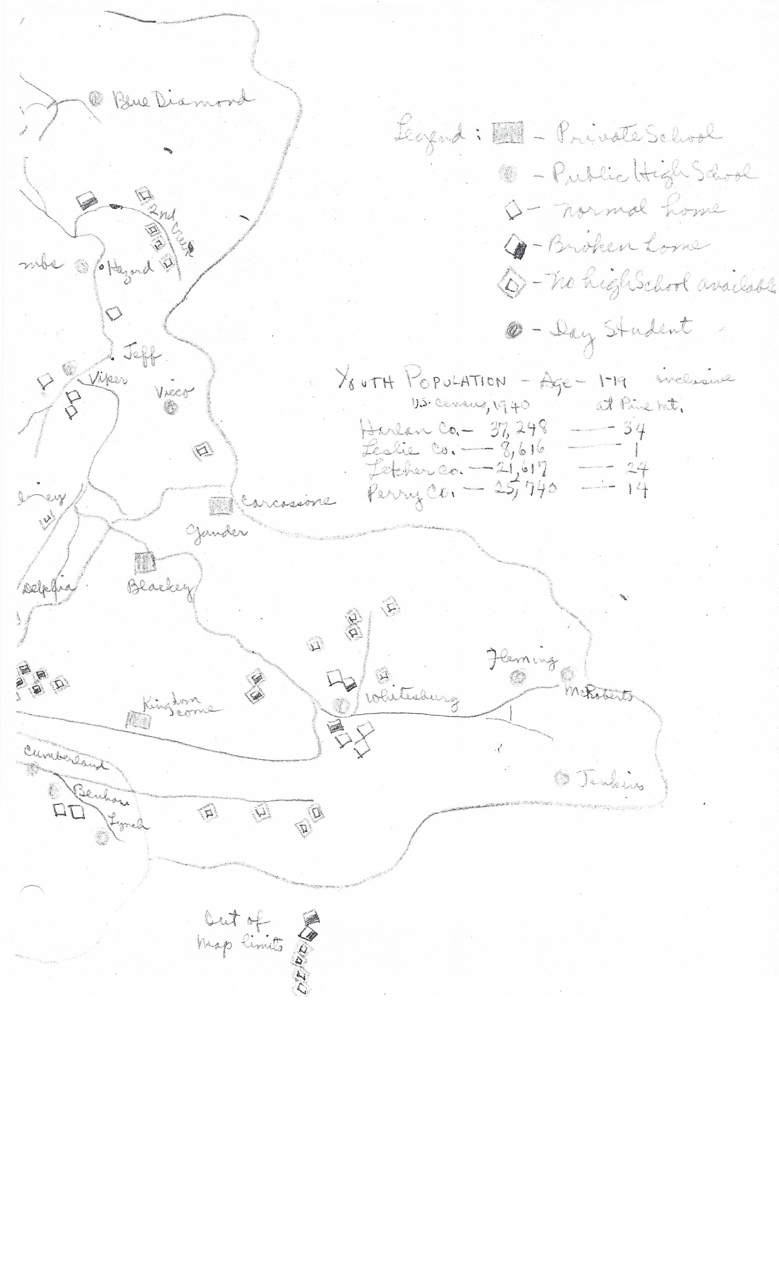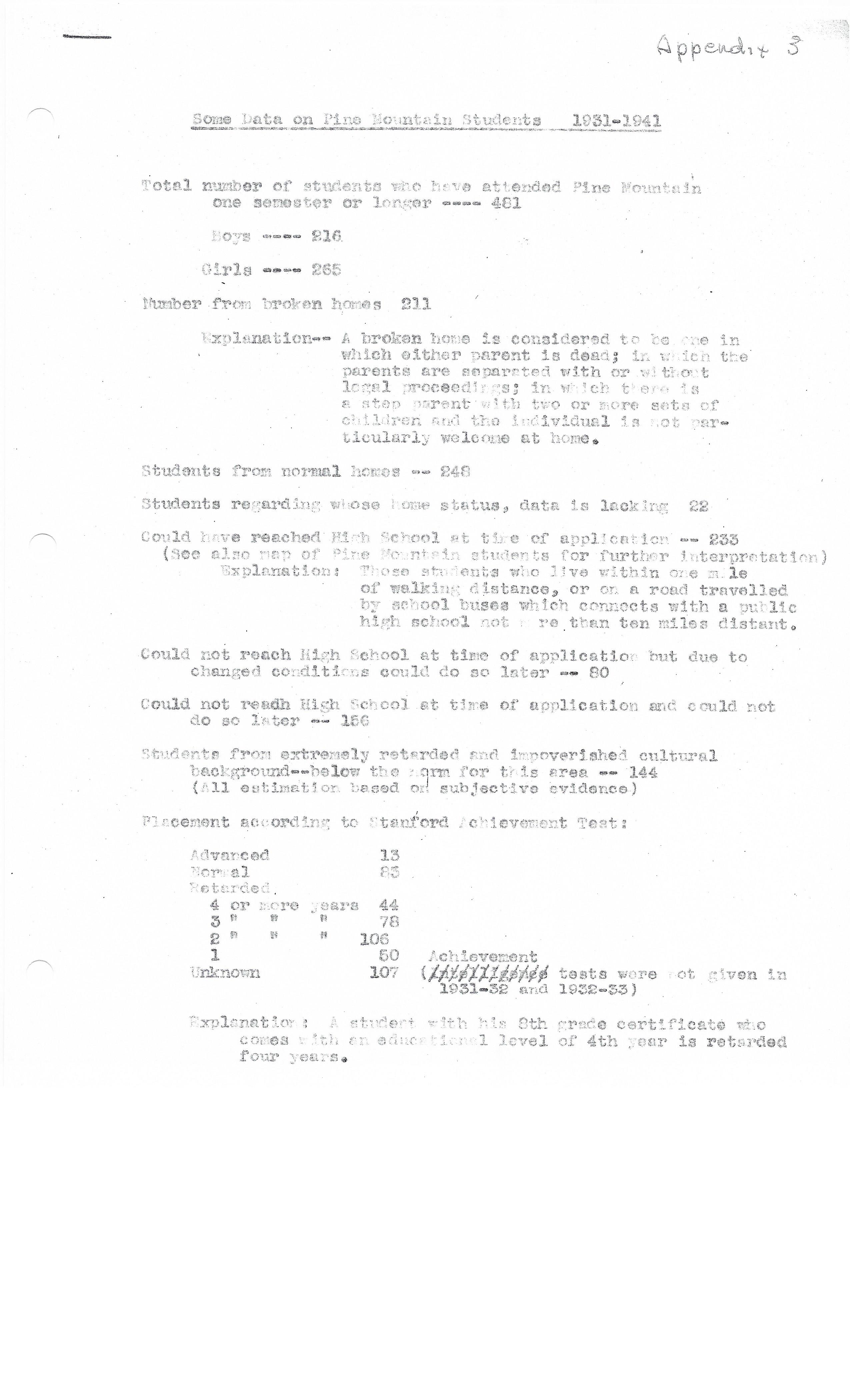 TAGS: Glyn Morris Study & Recommendations X Appendix; Glyn Morris; Directors; Pine Mountain Settlement School; Harlan County, KY; education; educational study; planning; institutional reports; institutional management; educational recommendations; 1942; institutional history; maps; charts; graphs; high school youth; student regional distribution; 1931-1941 data; appendices; “Educational temperature”; application forms; financial comparisons.