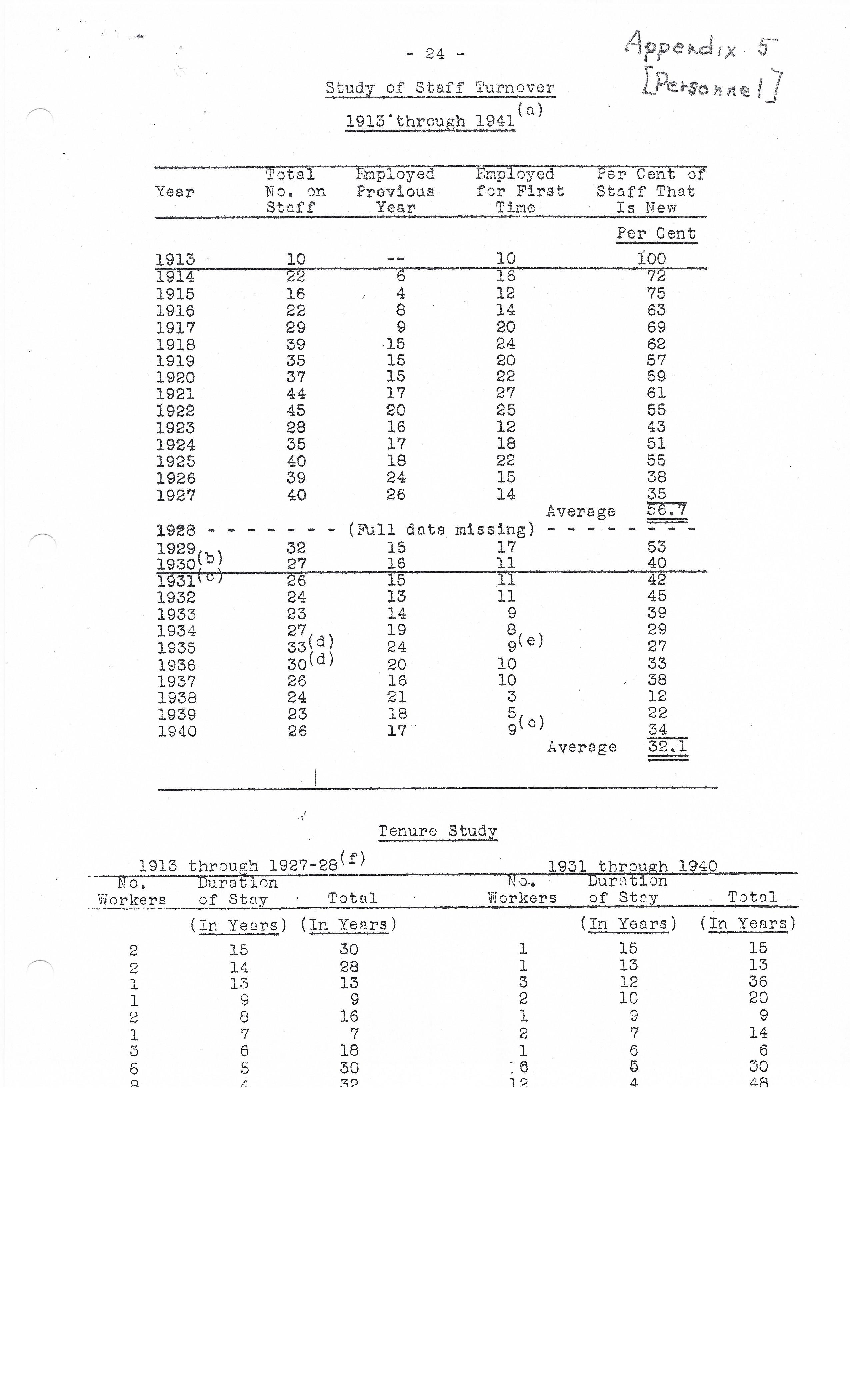 [Table of statistics consisting of 4 columns: Year, Total No. on Staff, Employed Previous Year Employed for First Time, Per Cent of Staff That is New]