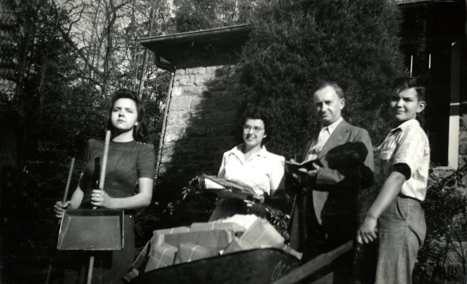 Mountain Day at PMSS, 1947. Mr. Benjamin, Libby, Margaret Dodd, Janice, Allen, [(?). [nace_1_075c.jpg]