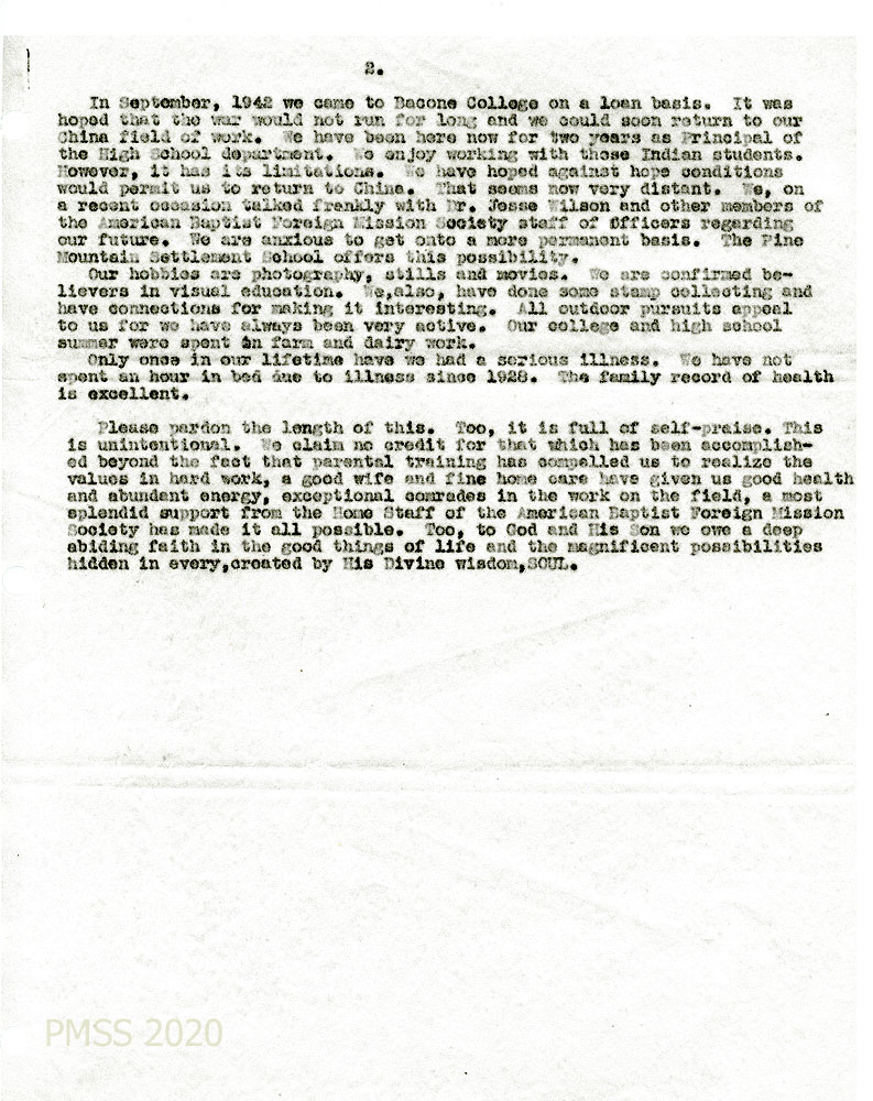 In September 1942, we came to Bacone College on a loan basis. It was hoped that the war would not run for long and we could soon return to our China field of work. We have been here now for two years as Principal of the High School department. We enjoy working with these Indian students. However, it has its limitations. We have hoped against hope conditions would permit us to return to China. That seems now very distant. We, on a recent occasion, talked frankly with Dr. Jesse Wilson and other members of the American Baptist Foreign Mission Society staff of officers regarding our future. We are anxious to get onto a more permanent basis. The Pine Mountain Settlement School offers this possibility.