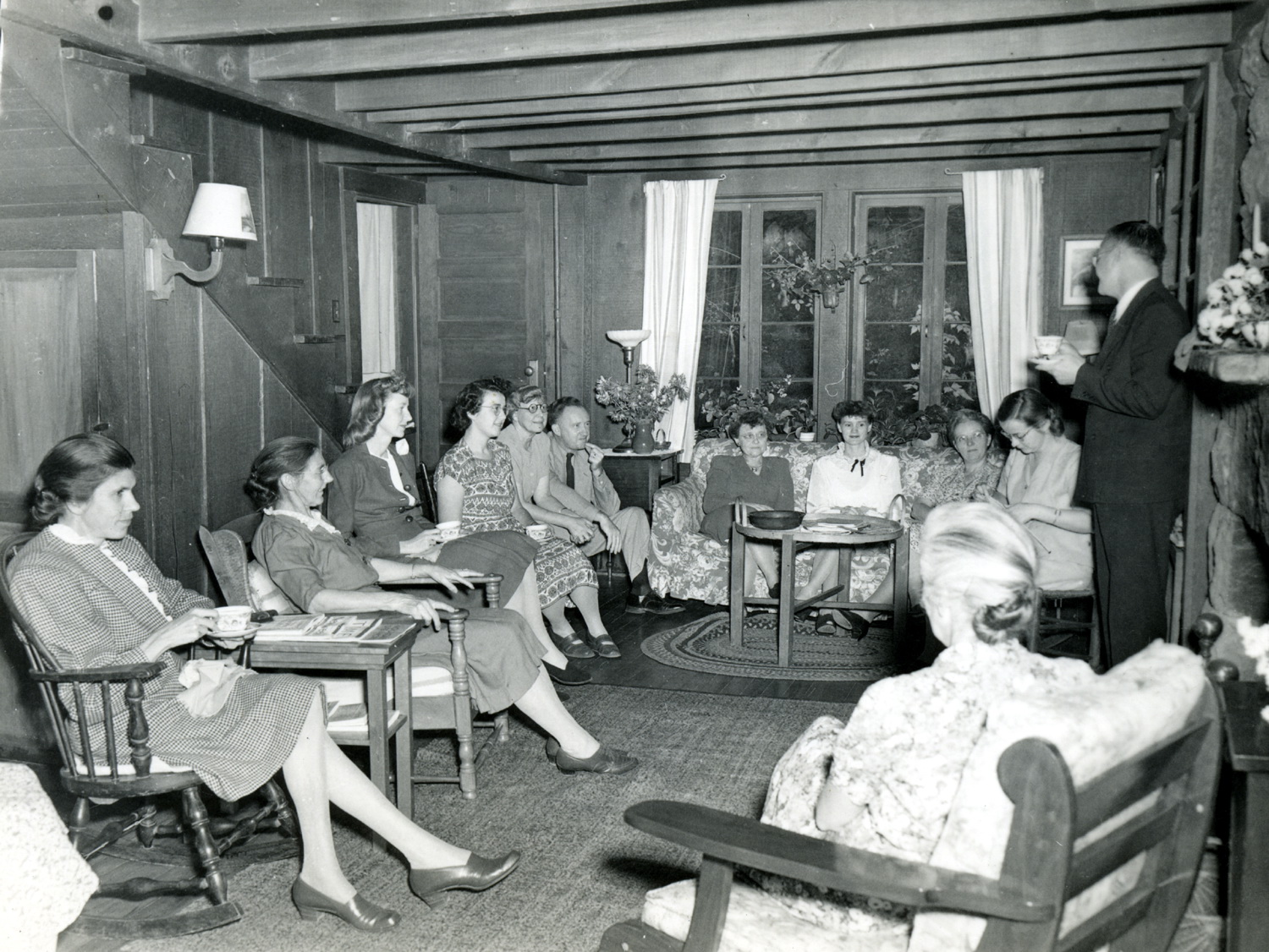 - Mr. and Mrs. Benjamin (6th and 7th from left) at staff meeting in Director Benjamin’s house (Zande House), late 1940s. (left to right) Gladys Hill, Fern Hayes, Ruth Smith, Margaret Motter, Mr. Benjamin, Mrs. Benjamin. [X_100_workers_2593_mod]