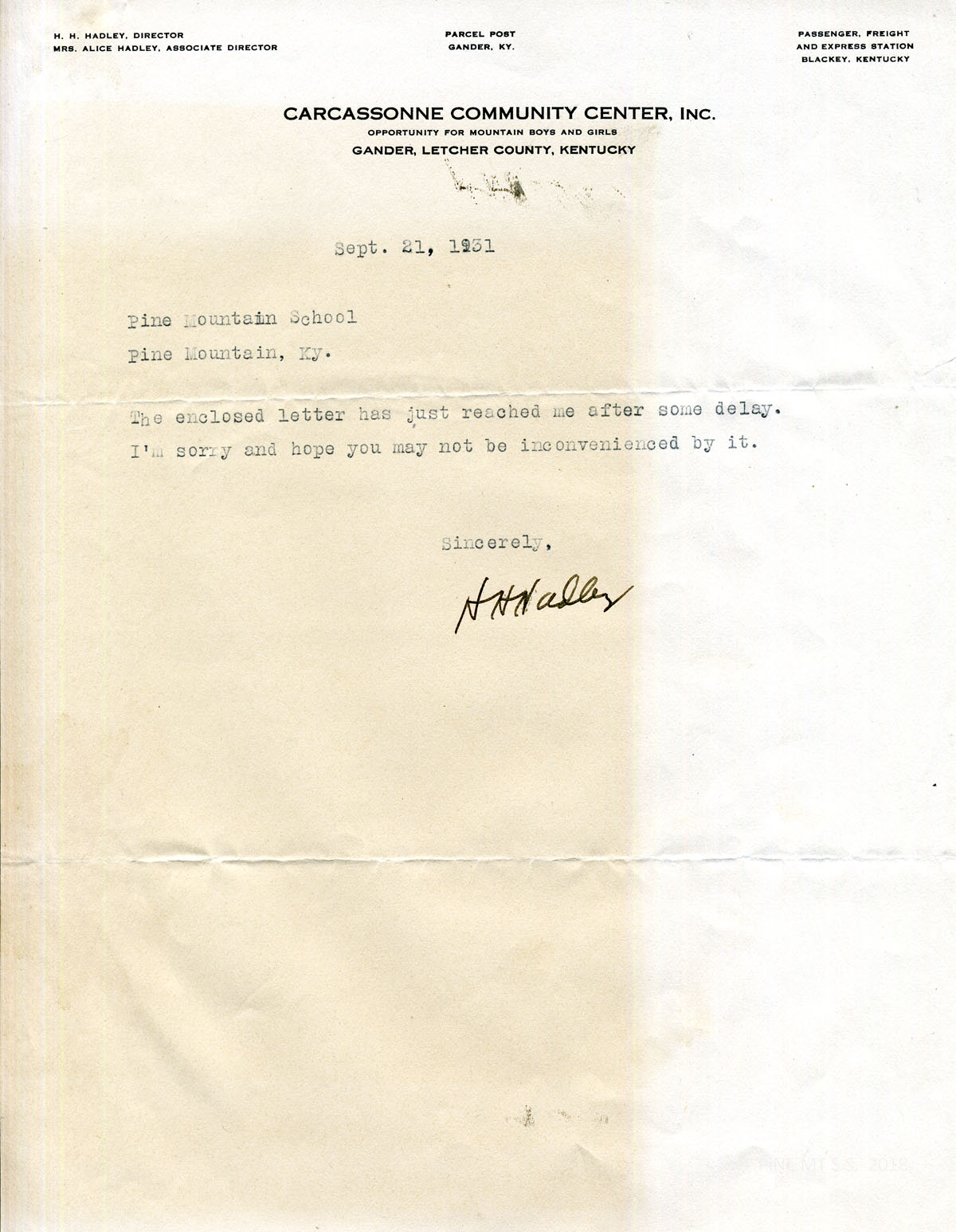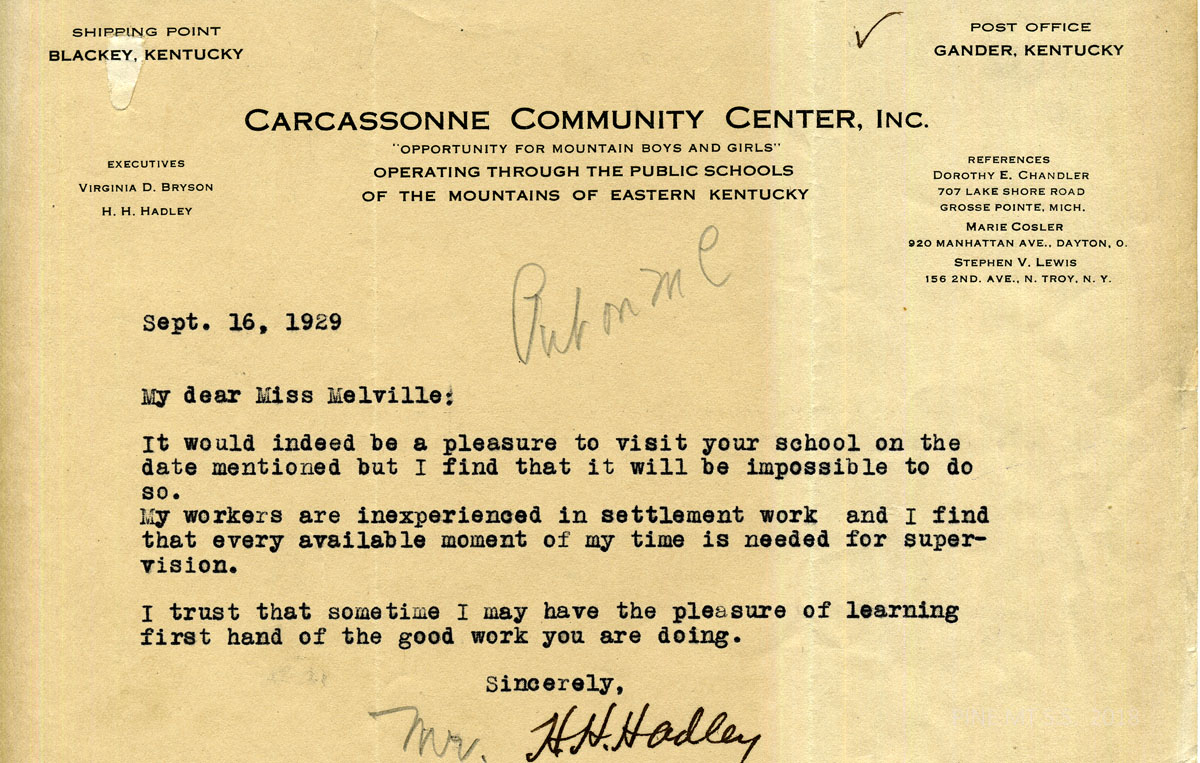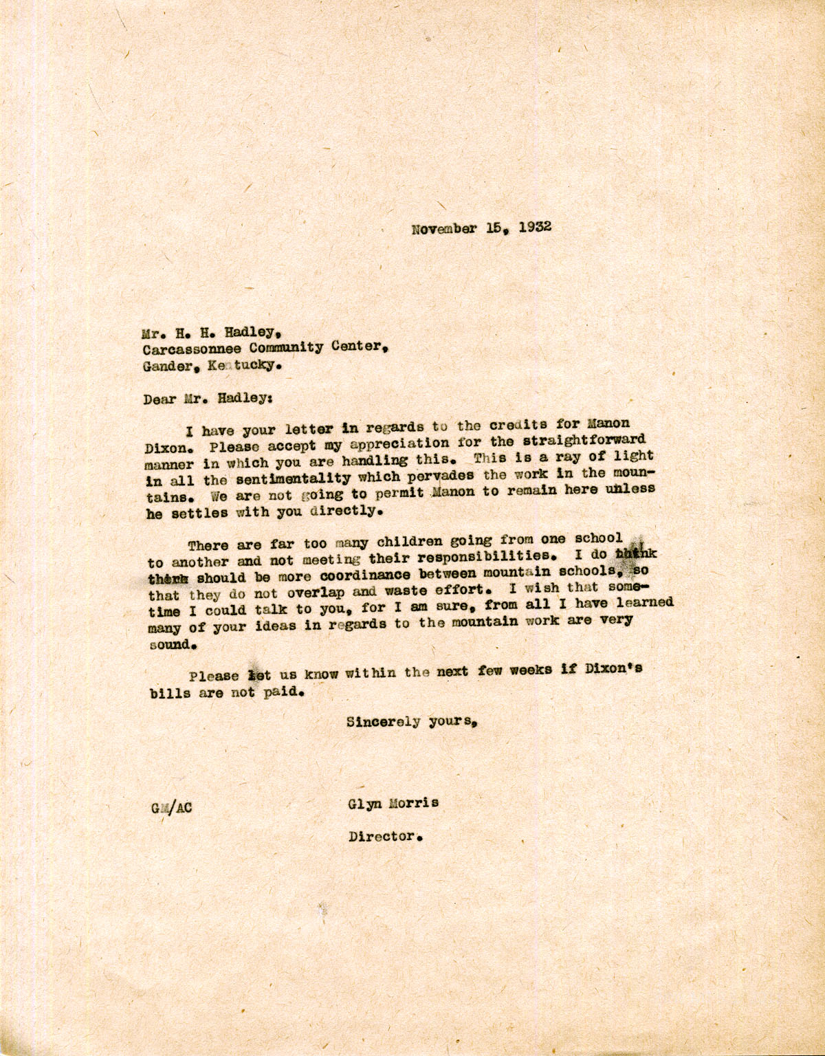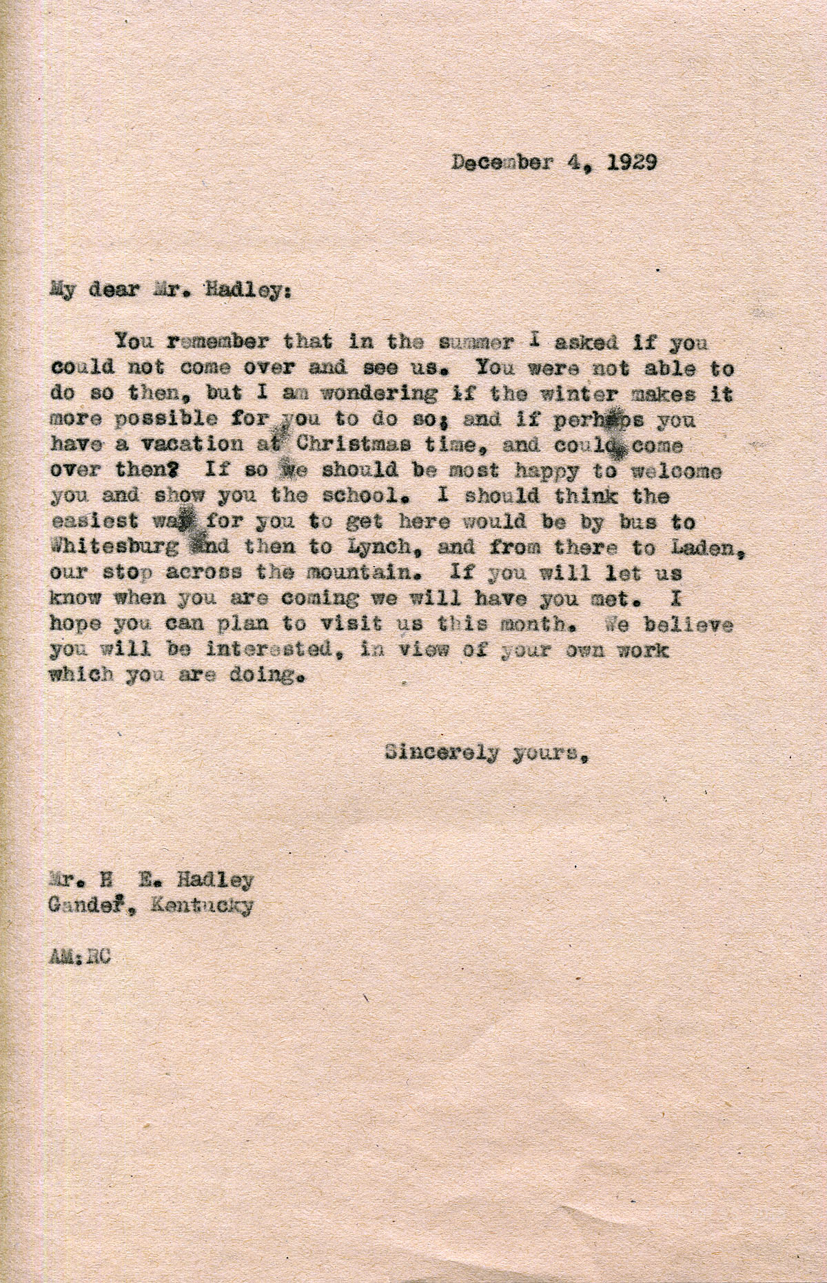 Hubert Hadley Correspondence displays images of letters, dated 1929 to 1939, to and from the Director of Pine Mountain Settlement School who served for one year, 1930-1931. Hubert Hadley’s term was just prior to that of Glyn Morris who succeeded him as PMSS Director and stayed for nearly ten years. Much of the correspondence in his file is with his successor, as he was working not far away at Carcassonne Community Center in Letcher County, Kentucky.