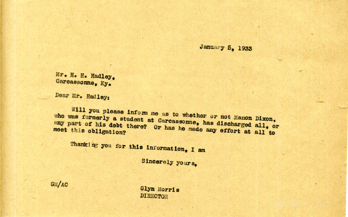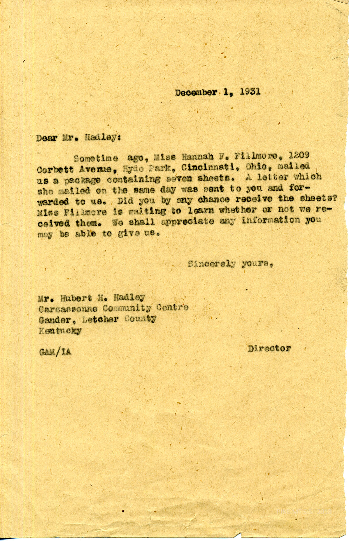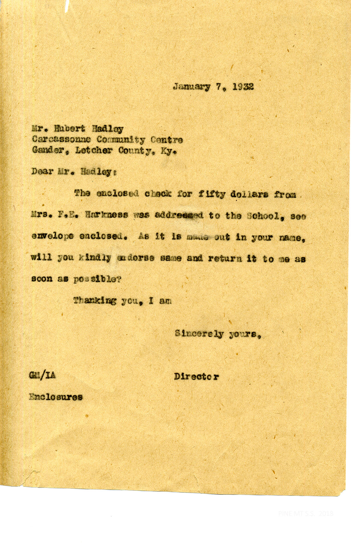 Hubert Hadley Correspondence displays images of letters, dated 1929 to 1939, to and from the Director of Pine Mountain Settlement School who served for one year, 1930-1931. Hubert Hadley’s term was just prior to that of Glyn Morris who succeeded him as PMSS Director and stayed for nearly ten years. Much of the correspondence in his file is with his successor, as he was working not far away at Carcassonne Community Center in Letcher County, Kentucky.