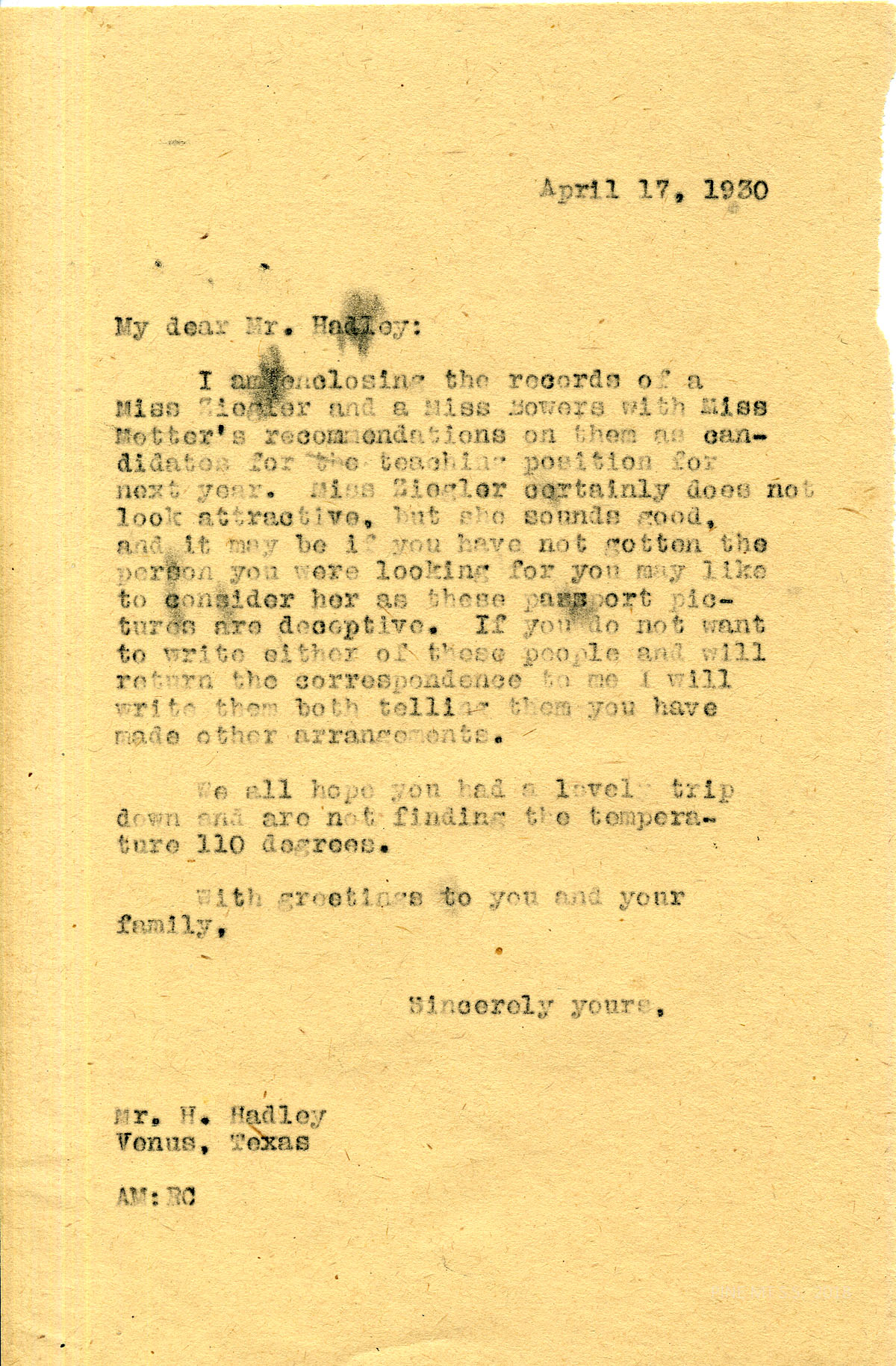 TAGS: Hubert Hadley correspondence, 1929-1939 director’s letters, Glyn Morris