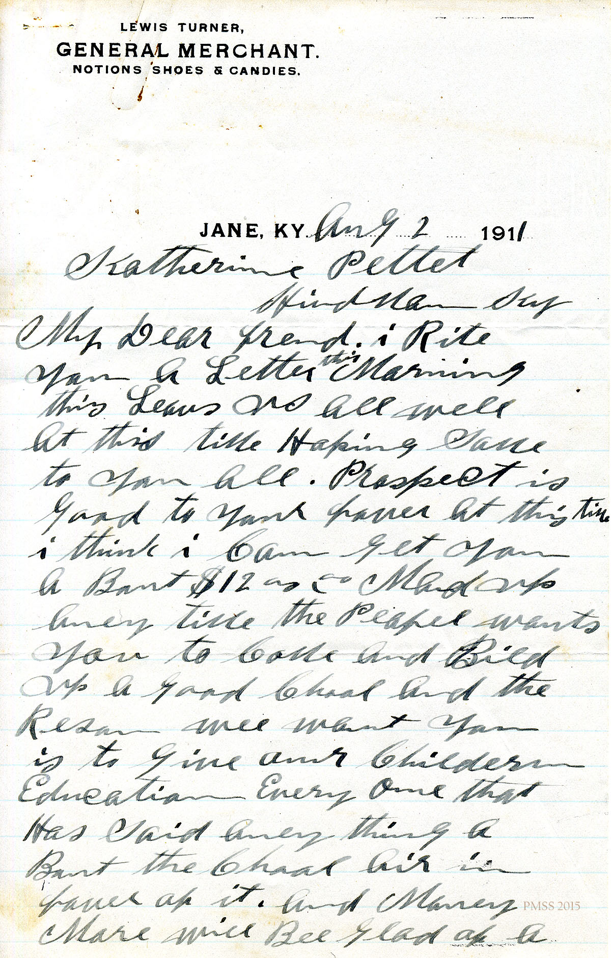 [001-003] August 2, 1911. Handwritten by Lewis Turner, General Merchant, “Notions, Shoes & Candies”, Jane, KY, to Miss Pettit, Hindman, KY. Why the people want Pettit to create a good school; invites Pettit to return.