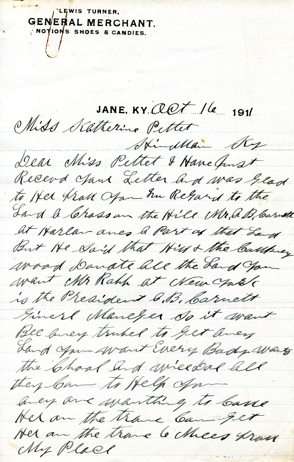 [008-010] October 16, 1911. Handwritten by Lewis Turner, General Merchant, “Notions, Shoes & Candies”, Jane, KY, to Miss Pettit, Hindman, KY. Mr. A.B. Cornett and his company will donate land; meeting Pettit on Nov. 4; travel directions.