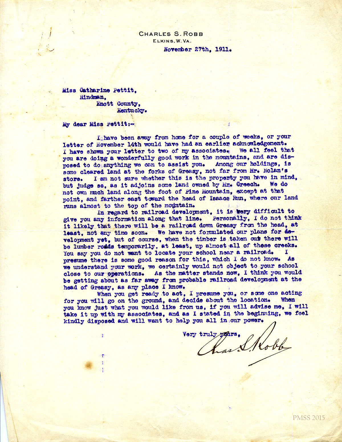 [013] November 27, 1911. Typewritten letter signed by Charles S. Robb, Elkins, W.Va., to Miss Pettit, Hindman, KY. Available land for school; railroad development.