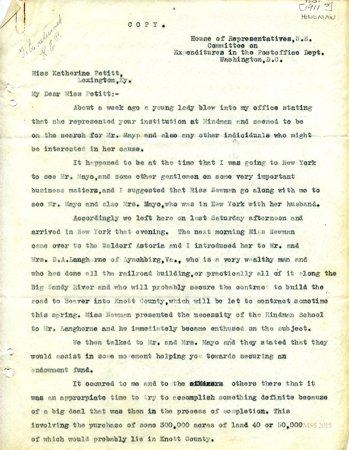 The letter of May 27, 1911, addressed to “My Dear Friend,” is central to understanding the processes that Pettit engaged and the people who were responsible for the turning of an idea into a reality. An original copy of the May 27, 1911, letter is not held by Pine Mountain. However, from its surrogate [a typewritten transcription], we learn the details of her journey to Big Laurel and the first contact she made with the Creech and Lewis families.