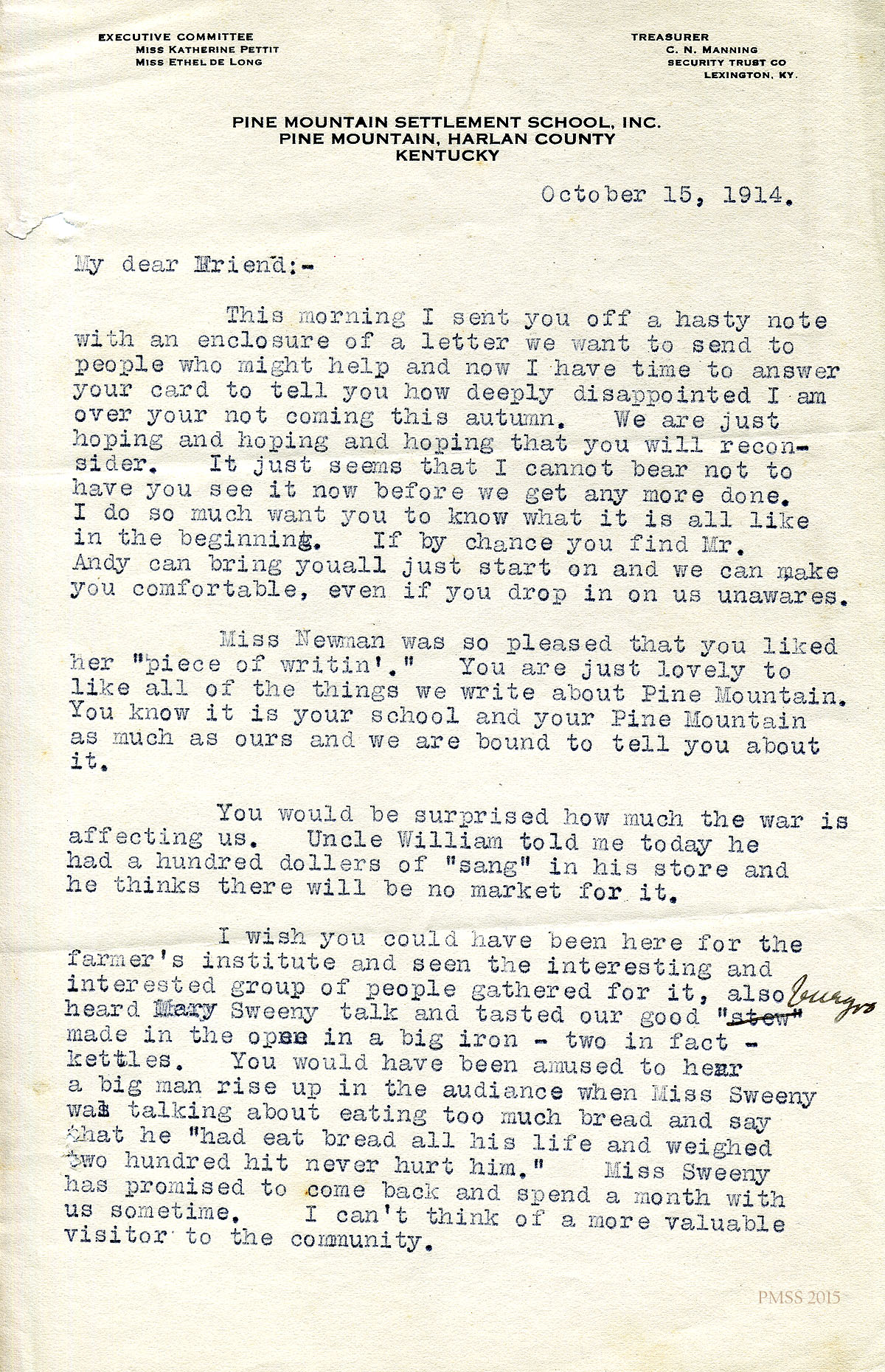 Pettit is disappointed that Mrs. Morton is not coming in Autumn. Notes that Eve Newman [Secretary] liked Morton’s comments on her writing for PMSS. Reports that WWI is disrupting the sale of ‘sang’ [ginseng]. Uncle William reported that he has over $100 in sang in his store and no market. Reports on the Farmer’s Institute at PMSS and Mary Sweeny‘s talk [on nutrition?] and stew [“Kentucky burgoo”] made in the open in iron kettles. Reports on trip made by Aunt Sal and Secretary Newman to Flurrie Metcalf‘s “across the ridge” where they describe the home and its contents mostly hand-made. Also describes the impromptu dinner made from locally grown resources: chestnuts, chicken peaches, fresh eggs.